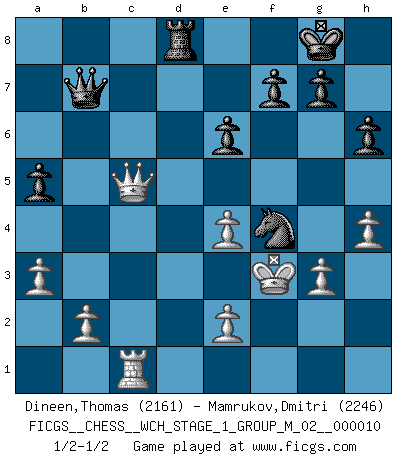 Last move : 1/2-1/2 2012 February 5 16:20:52 [Event "FICGS__CHESS__WCH_STAGE_1_GROUP_M_02__000010"] [Site "FICGS"] [Date "2012.01.01"] [Round "1"] [White "Dineen,Thomas"] [Black "Mamrukov,Dmitri"] [Result "1/2-1/2"] [WhiteElo "2161"] [BlackElo "2246"] 1.d4 Nf6 2.c4 e6 3.Nf3 b6 4.g3 Ba6 5.Qa4 Bb7 6.Bg2 c5 7.dxc5 Bxc5 8.O-O O-O 9.Nc3 Be7 10.Rd1 Na6 11.Bf4 Nc5 12.Qc2 Qc8 13.Rd4 d5 14.Rc1 Nce4 15.Nxe4 dxe4 16.Ne5 h6 17.R4d1 Bc5 18.a3 a5 19.h4 e3 20.fxe3 Bxg2 21.Kxg2 Qb7+ 22.e4 Rfd8 23.Kf3 Nh5 24.Nd3 Be7 25.c5 bxc5 26.Nxc5 Bxc5 27.Rxd8+ Rxd8 28.Qxc5 Nxf4 1/2-1/2 Queen's Indian : Nimzovich variation (exaggerated Fianchetto) Kingside Castling by player White (move 8) Kingside Castling by player Black (move 8) This chess game ended in a draw. Follow this game move after move (download)You know, comrade Pachman, I don't enjoy being a Minister, I would rather play Chess like you. (Che Guevara) Nach Morphy wurde nichts neues mehr in der Behandlung offener Positionen gefunden. (Mikhail Moiseyevich Botvinik) El Ajedrez no es una pizca de inferior al violín, y tenemos un gran número de violinistas profesionales. (Mikhail Botvinnik) La solitude du joueur d'Echecs à l'approche du mat est semblable à celle du condamné. (Francis Szpiner) All men can see these tactics whereby I conquer, but what none can see is the strategy out of which victory is evolved. (Sun Tzu)