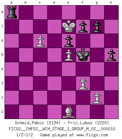 Last move : 1/2-1/2 2012 November 6 20:24:6 [Event "FICGS__CHESS__WCH_STAGE_1_GROUP_M_02__000010"] [Site "FICGS"] [Date "2012.01.01"] [Round "1"] [White "Schmid,Pablo"] [Black "Fric,Lubos"] [Result "1/2-1/2"] [WhiteElo "2194"] [BlackElo "2220"] 1.d4 d5 2.Bf4 Nf6 3.e3 c5 4.c3 Nc6 5.Nd2 Bf5 6.Qb3 Qd7 7.Ngf3 c4 8.Qd1 b5 9.Ne5 Nxe5 10.dxe5 Ne4 11.Nxe4 Bxe4 12.f3 Bg6 13.b3 e6 14.h4 h6 15.h5 Bh7 16.a4 a5 17.axb5 Qxb5 18.bxc4 dxc4 19.Qd4 Rc8 20.Qa7 Ba3 21.Bxc4 Qxc4 22.Rxa3 O-O 23.Kf2 Rb8 24.Kg3 Qe2 25.e4 Rb2 26.Rg1 Bxe4 27.Qe3 Bd5 28.Qxe2 Rxe2 29.Rxa5 Rc8 30.Ra3 Kh7 31.Rd1 Rc2 32.Rd3 Rc7 33.Bd2 Rb7 34.Kf2 Rb1 35.Ra4 Rh1 36.R3d4 Rxh5 37.c4 Bc6 38.Ra6 Bb7 39.Ra5 Rh1 40.Ke3 Rg1 41.Kd3 Rb2 42.Kc3 Rgb1 43.Rd7 Kg6 44.Ra3 Bc6 45.Rd6 Bb7 46.c5 Kf5 47.Rd7 Kg6 48.Ra7 Rb3+ 49.Kd4 h5 50.Raxb7 Rxb7 51.Rxb7 Rxb7 52.c6 Rc7 53.Kc5 Rc8 54.Be1 Kf5 55.Kd6 Rd8+ 56.Ke7 Ra8 1/2-1/2 Queen's pawn, Mason variation Kingside Castling by player Black (move 22) This chess game ended in a draw. Follow this game move after move (download)If one piece is badly posted, the whole game is bad. (Tarrasch) Je mehr wir mit Computern analysieren, desto mehr glauben wir an Verteidigung. (Vladimir Kramnik) Los problemas de Ajedrez exigen del compositor las mismas virtudes que caracterizan todo el arte de valor: originalidad, invención, concisión, armonía, complejidad e insinceridad explendida. (Vladimir Nabokov) Les Echecs sont et restent toujours un combat, un combat intégral comme la boxe, la lutte ou un autre sport, et où il doit y avoir un vainqueur et un vaincu. (Joseph Emil Diemer) CHESS, n. f. [echecs, Fr.] A nice and abstruse game, in which two sets of puppets are moved in opposition to each other. (Dr Samuel Johnson, A Dictionary Of The English Language, 1755)