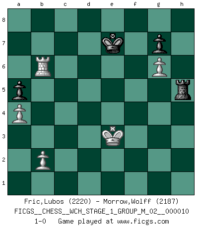 Last move : 1-0 2012 April 5 10:45:57 [Event "FICGS__CHESS__WCH_STAGE_1_GROUP_M_02__000010"] [Site "FICGS"] [Date "2012.01.01"] [Round "1"] [White "Fric,Lubos"] [Black "Morrow,Wolff"] [Result "1-0"] [WhiteElo "2220"] [BlackElo "2187"] 1.Nf3 Nf6 2.d4 e6 3.c4 b6 4.g3 Bb7 5.Bg2 c5 6.d5 exd5 7.cxd5 Bxd5 8.Nc3 Bxf3 9.Bxf3 Nc6 10.Qa4 Qc8 11.g4 Bd6 12.Bf4 Bxf4 13.Qxf4 O-O 14.g5 Ne8 15.Rg1 Qc7 16.Qh4 Rd8 17.Rg3 Ne5 18.Be4 Ng6 19.Bxg6 fxg6 20.Rh3 d5 21.Qxh7+ Kf7 22.Rf3+ Ke7 23.Re3+ Kf7 24.O-O-O d4 25.Rf3+ Ke7 26.Qxg6 Rxf3 27.Qe4+ Kf8 28.Qxf3+ Kg8 29.g6 Nf6 30.Ne4 Qe5 31.Nxf6+ Qxf6 32.Qe4 Qg5+ 33.e3 Qd5 34.Qxd5+ Rxd5 35.exd4 cxd4 36.h4 Kf8 37.Rd3 Rf5 38.Rxd4 Ke7 39.Rc4 Kd7 40.Ra4 a5 41.Rd4+ Ke7 42.Rd3 Rxf2 43.Rb3 Rf1+ 44.Kd2 Rf2+ 45.Ke3 Rf6 46.h5 Rf5 47.Rxb6 Rxh5 48.a4 1-0 Comment by player 2 : Wolff Morrow : My experiment with 5...c5? got handily refuted. It literally gave white the winning advantage, which was forced to the full point via excellent and deep computer analysis by white. I actually thought I might could have salvaged a draw in the endgame, but I didn't realize I was in fact quite lost. Interesting to note is that Houdini doesn't realize the endgame is lost, but Rybka does. It's only when it's far too late that Houdini finally catches on that white has a won endgame. Reti Opening Kingside Castling by player Black (move 13) Queenside Castling by player White (move 24) 10 pieces endgame at move 47 : White KRPPPP , Black KRPP WHITE : King + 1 Rook 4 Pawns BLACK : King + 1 Rook 2 Pawns 9 pieces endgame at move 47 : White KRPPP , Black KRPP WHITE : King + 1 Rook 3 Pawns BLACK : King + 1 Rook 2 Pawns Player White won this chess game. Follow this game move after move (download)Fischer is completely natural. He plays no roles. He's like a child. Very, very simple. (Zita Rajcsanyi) Schach ist eine Sache der genauen Beurteilung, wann man zuschlagen und wann man sich ducken muss. (Robert James Fischer) El Ajedrez lo es todo: arte, ciencia y deporte. (Anatoly Karpov) Les échecs, c'est la lutte contre l'erreur. (Johannes Zukertort) Life is verb, not a noun. (Charlotte Perkins Gilman)