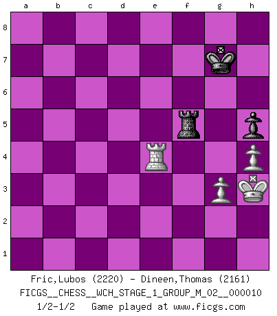 Last move : 1/2-1/2 2012 September 5 2:23:21 [Event "FICGS__CHESS__WCH_STAGE_1_GROUP_M_02__000010"] [Site "FICGS"] [Date "2012.01.01"] [Round "1"] [White "Fric,Lubos"] [Black "Dineen,Thomas"] [Result "1/2-1/2"] [WhiteElo "2220"] [BlackElo "2161"] 1.Nf3 d5 2.d4 Nf6 3.c4 c6 4.Nc3 e6 5.e3 Nbd7 6.Qc2 Bd6 7.Bd3 dxc4 8.Bxc4 b5 9.Be2 O-O 10.O-O Bb7 11.Rd1 Qc7 12.Bd2 a6 13.b4 e5 14.h3 exd4 15.exd4 Rfe8 16.a3 a5 17.Rac1 axb4 18.axb4 Qb8 19.d5 Nxd5 20.Nxd5 cxd5 21.Bxb5 Rc8 22.Qb2 Rxc1 23.Rxc1 Ne5 24.Be2 Ba6 25.Bc3 Nd3 26.Bxd3 Bxd3 27.Ne5 Bb5 28.Ng4 f6 29.Rd1 Be8 30.Ne3 Qb7 31.Nxd5 Bf8 32.Qc2 Kh8 33.Rd4 Bg6 34.Qd2 Qc6 35.Qe2 Bf7 36.b5 Qb7 37.Qd3 Bg6 38.Qf3 Rc8 39.Qf4 Qxb5 40.Nxf6 Qf5 41.Qxf5 Bxf5 42.Nd5 Bc5 43.Rd2 Rd8 44.Re2 Bg6 45.Re5 Bd6 46.Rg5 Rd7 47.h4 Bd3 48.Be5 Bf8 49.Nf4 Bc4 50.Rg3 Kg8 51.Kh2 Ba2 52.Nh5 Ra7 53.Nf6+ Kh8 54.Ne4 Bd5 55.Bd6 Bxe4 56.Bxf8 Rf7 57.Re3 Rxf2 58.Bxg7+ Kxg7 59.Rxe4 h5 60.Kh3 Rf5 61.g3 1/2-1/2 Reti Opening Kingside Castling by player Black (move 9) Kingside Castling by player White (move 10) 10 pieces endgame at move 57 : White KRBPP , Black KRBPP WHITE : King + 1 Rook 1 Bishop 2 Pawns BLACK : King + 1 Rook 1 Bishop 2 Pawns 9 pieces endgame at move 58 : White KRBPP , Black KRBP WHITE : King + 1 Rook 1 Bishop 2 Pawns BLACK : King + 1 Rook 1 Bishop 1 Pawn 8 pieces endgame at move 58 : White KRPP , Black KRBP WHITE : King + 1 Rook 2 Pawns BLACK : King + 1 Rook 1 Bishop 1 Pawn 7 pieces endgame at move 59 : White KRPP , Black KRP WHITE : King + 1 Rook 2 Pawns BLACK : King + 1 Rook 1 Pawn This chess game ended in a draw. Follow this game move after move (download)Pawns: they are the soul of this game, they alone form the attack and defense. (Philidor) Ein Kibitz ist einer, der deinem Gegner gute Ratschläge gibt. (Andrew Soltis) Durante una competencia de Ajedrez, un Maestro de Ajedrez deberá ser una combinación de presa de caza y un Monge. (Alexander Alekhine) Le génie consiste à savoir transgresser les règles au moment opportun. (Teichmann) True nature is revealed in times of difficulty. (Chinese proverb)