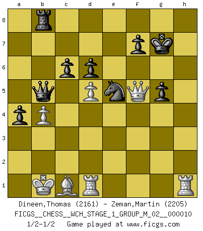 Last move : 1/2-1/2 2012 May 20 23:12:48 [Event "FICGS__CHESS__WCH_STAGE_1_GROUP_M_02__000010"] [Site "FICGS"] [Date "2012.01.01"] [Round "1"] [White "Dineen,Thomas"] [Black "Zeman,Martin"] [Result "1/2-1/2"] [WhiteElo "2161"] [BlackElo "2205"] 1.d4 Nf6 2.c4 g6 3.Nc3 Bg7 4.e4 d6 5.f3 O-O 6.Be3 Nc6 7.Nge2 a6 8.Qd2 Re8 9.h4 h5 10.O-O-O b5 11.Nd5 Rb8 12.Nxf6+ exf6 13.Ng3 bxc4 14.Bxc4 a5 15.Rhe1 a4 16.a3 Ra8 17.Ba2 Na5 18.Kb1 Ba6 19.Qc3 c6 20.Nf1 Rb8 21.g4 hxg4 22.h5 g5 23.h6 Bxh6 24.Ng3 Bg7 25.Rh1 Qb6 26.fxg4 Bc4 27.Bxc4 Nxc4 28.b4 Qb5 29.Nf5 Rxe4 30.Bc1 Rxg4 31.Nxg7 Kxg7 32.Qf3 f5 33.d5 Ne5 34.Qxf5 Rxb4+ 35.axb4 1/2-1/2 King's Indian : Saemisch, Panno formation Kingside Castling by player Black (move 5) Queenside Castling by player White (move 10) This chess game ended in a draw. Follow this game move after move (download)Chess is 99 percent tactics. (Teichmann) Ein Gewinn durch eine ungenaue Kombination, sei sie auch noch so vorzeigbar, erfüllt mich mit Schaudern. (Wilhelm Steinitz) Observen a Garry Kasparov. Después de una derrota, invariablemente el gana la próxima partida. Prácticamente hace pedazos a su siguiente oponente. Eso es algo que tenemos que aprender a lograr. (Maurice Ashley) Je menace de comprendre la position. (Anonyme) The ultimate in disposing one's troops is to be without ascertainable shape. Then the most penetrating spies cannot pry in nor can the wise lay plans against you. (Sun Tzu)