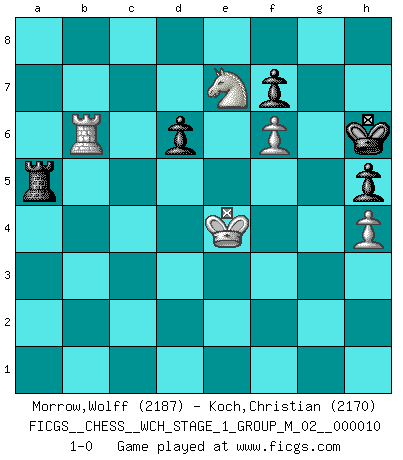 Last move : 1-0 2012 March 17 15:28:18 [Event "FICGS__CHESS__WCH_STAGE_1_GROUP_M_02__000010"] [Site "FICGS"] [Date "2012.01.01"] [Round "1"] [White "Morrow,Wolff"] [Black "Koch,Christian"] [Result "1-0"] [WhiteElo "2187"] [BlackElo "2170"] 1.e4 c5 2.Nf3 d6 3.d4 cxd4 4.Nxd4 Nf6 5.Nc3 a6 6.Be3 e5 7.Nb3 Be6 8.f3 h5 9.Qd2 Nbd7 10.Nd5 Nxd5 11.exd5 Bf5 12.Be2 h4 13.O-O Be7 14.Na5 Qc7 15.c4 h3 16.g4 Bg6 17.b4 Rd8 18.g5 O-O 19.Rac1 Rfe8 20.Rfd1 Nb6 21.Bd3 Rf8 22.Kh1 Na4 23.Rg1 Qd7 24.Rg3 Rc8 25.Qc2 Bxd3 26.Qxd3 g6 27.f4 exf4 28.Bxf4 Rfe8 29.Be3 Bf8 30.Bd4 Bg7 31.Bxg7 Kxg7 32.Rxh3 Kg8 33.Rf1 b6 34.Nc6 Qg4 35.Rhf3 Nb2 36.Qc2 Qxc4 37.Qxb2 Qxd5 38.b5 axb5 39.Nb4 Qe4 40.Qf6 Rc7 41.Nd3 Qd5 42.Kg1 Qe6 43.Nf4 Qxf6 44.gxf6 Re4 45.Nd5 Rc5 46.Ne7+ Kh7 47.Rh3+ Rh5 48.Rxh5+ gxh5 49.Rf5 Kh6 50.Rxb5 Re1+ 51.Kf2 Ra1 52.h4 Rxa2+ 53.Kf3 Ra3+ 54.Ke4 Ra5 55.Rxb6 1-0 Comment by player 1 : Wolff Morrow : This was a tricky transition into a winning endgame. If black had been able to liquidate all the pawns, my extra knight would not have been enough to win. The key move that secured the win was 43. Nf4 Sicilian : Najdorf, Byrne (English) attack Kingside Castling by player White (move 13) Kingside Castling by player Black (move 18) 10 pieces endgame at move 55 : White KRNPP , Black KRPPP WHITE : King + 1 Rook 1 Knight 2 Pawns BLACK : King + 1 Rook 3 Pawns Player White won this chess game. Follow this game move after move (download)White lost because he failed to remember the right continuation and had to think up the moves himself. (Siegbert Tarrasch) Spiel ein langweiliges Spiel zu Ende und lustige Dinge können passieren. (Hans Ree) Un buen sacrificio es aquel que aunque no sea necesariamente sólido, deja a tu oponente aturdido y confuso. (Rudolph Spielmann) Aux échecs, l'amour-propre est satisfait quand on remporte la victoire, mais il n'y a pas de honte à être battu. (Benjamin Franklin) Somehow our devils are never quite what we expect when we meet them face to face. (Nelson DeMille)