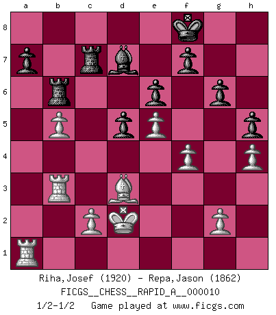 Last move : 1/2-1/2 2007 January 24 21:15:24 [Event "FICGS__CHESS__RAPID_A__000010"] [Site "FICGS"] [Date "2007.01.12"] [Round "1"] [White "Riha,Josef"] [Black "Repa,Jason"] [Result "1/2-1/2"] [WhiteElo "1920"] [BlackElo "1862"] 1.d4 e6 2.e4 d5 3.Nc3 Nf6 4.Bg5 Bb4 5.e5 h6 6.Bd2 Bxc3 7.bxc3 Ne4 8.Qg4 g6 9.Bd3 Nxd2 10.Kxd2 c5 11.h4 Qa5 12.Nf3 Nc6 13.Qf4 cxd4 14.Nxd4 Nxd4 15.Qxd4 Bd7 16.Rab1 b6 17.Qb4 Qxb4 18.cxb4 O-O 19.f4 h5 20.b5 Rfc8 21.Rb3 Rc7 22.a4 Rac8 23.a5 Rb8 24.axb6 Rxb6 25.Ra1 Kf8 1/2-1/2 Queen's pawn Kingside Castling by player Black (move 18) This chess game ended in a draw. Follow this game move after move (download)Bobby is the most misunderstood, misquoted celebrity walking the face of this earth. (Yasser Seirawan) Zeige mir drei Eröffnungsvarianten und ich beweise dir, dass zwei davon inkorrekt sind. (Emanuel Lasker) Bobby es el jugador de Ajedrez mas fino que este país jamás haya producido. Su memoria para las movidas, su brillantez en soñar combinaciones y su feróz determinación por la victoria son algo extraño. (John Collins) La vie et les Echecs sont tous les deux une lutte constante. (Lasker) You must do what you feel is right... of course. (Obi-Wan Kenobi in Star Wars ep.4)