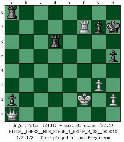 Last move : 1/2-1/2 2012 March 11 20:50:36 [Event "FICGS__CHESS__WCH_STAGE_1_GROUP_M_03__000010"] [Site "FICGS"] [Date "2012.01.01"] [Round "1"] [White "Unger,Peter"] [Black "Gazi,Miroslav"] [Result "1/2-1/2"] [WhiteElo "2181"] [BlackElo "2271"] 1.d4 Nf6 2.Nf3 d5 3.c4 e6 4.g3 dxc4 5.Bg2 a6 6.O-O Nc6 7.e3 Bd7 8.Qe2 b5 9.b3 cxb3 10.axb3 Bd6 11.Bb2 O-O 12.Rc1 Nd5 13.Ne5 Qe8 14.Nd2 Be7 15.Nd3 Ncb4 16.Nxb4 Bxb4 17.e4 Nf6 18.Rxc7 a5 19.Nf1 a4 20.Ne3 Qd8 21.Rc2 a3 22.Bc3 Bxc3 23.Rxc3 b4 24.Rc5 Rb8 25.e5 Nd5 26.Bxd5 exd5 27.Qd2 Be6 28.f4 Qd7 29.f5 Bxf5 30.Rxd5 Qc8 31.Rc1 Ra8 32.Rxc8 Rfxc8 33.Qe1 a2 34.Qa1 Be6 35.Rb5 Rc3 36.Nc4 Bxc4 37.bxc4 Rxc4 38.d5 h5 39.d6 Kh7 40.Rb6 Rc5 41.Rxb4 Rxe5 42.Kf2 Rd5 43.Rb7 Rxd6 44.Rxf7 1/2-1/2 Queen's pawn game Kingside Castling by player White (move 6) Kingside Castling by player Black (move 11) This chess game ended in a draw. Follow this game move after move (download)It was clear to me that the vulnerable point of the American Grandmaster (Bobby Fischer) was in double-edged, hanging, irrational positions, where he often failed to find a win even in a won position. (Efim Geller) Es ist wirklich schade, dass so viele Schachspieler nicht auf ihr Äußeres achten! (Alexandra Kosteniuk) El Ajedrez es tan inspirador que yo no creo que un buen jugador sea capaz de tener un pensamiento malo durante una partida. (Wilhelm Steinitz) Les échecs c'est le défi de l'alpiniste, toujours plus haut, prêt à tout pour monter à l'assaut du Roi ennemi. Les échecs, c'est de la musique en mouvement, un ballet majestueux pour les yeux. C'est de la poésie composée par les fantômes du passé qui au même titre que Rimbaud ou Verlaine méritent notre admiration. Les échecs, c'est de la peinture ou le moindre mouvement modifie le tableau pour en faire un Picasso ou un Van Gogh. Les échecs, c'est tout et rien, c'est la vie et la mort. Jjulie33 sur le forum de France-Echecs. A computer lets you make more mistakes faster than any invention in human history - with the possible exceptions of handguns and tequila. (Mitch Ratcliffe)