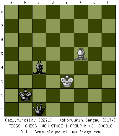 Last move : 0-1 2012 November 5 20:3:10 [Event "FICGS__CHESS__WCH_STAGE_1_GROUP_M_03__000010"] [Site "FICGS"] [Date "2012.01.01"] [Round "1"] [White "Gazi,Miroslav"] [Black "Kokoryukin,Sergey"] [Result "0-1"] [WhiteElo "2271"] [BlackElo "2174"] 1.d4 Nf6 2.Bg5 d5 3.Bxf6 exf6 4.e3 Be6 5.g3 Bd6 6.Bg2 c6 7.Ne2 O-O 8.O-O Nd7 9.Qd3 Nb6 10.Nd2 Re8 11.Nf4 Bxf4 12.exf4 g6 13.Rfe1 Nc8 14.Nf1 Nd6 15.Ne3 Kg7 16.a4 a5 17.Qa3 Nf5 18.Qc5 Nxe3 19.Rxe3 Bf5 20.Rxe8 Qxe8 21.Bf1 h6 22.Rc1 Qe6 23.Qc3 h5 24.h4 Qe7 25.Qc5 Qc7 26.Re1 b6 27.Qc3 c5 28.Bd3 Bd7 29.dxc5 bxc5 30.f5 gxf5 31.Bb5 Be6 32.Qf3 Rh8 33.Kg2 Rd8 34.Qxh5 c4 35.Qe2 d4 36.Kh2 f4 37.Qf3 fxg3+ 38.fxg3 d3 39.cxd3 Rxd3 40.Re3 Rb3 41.Qf2 Rb4 42.Qd2 Qc5 43.Re2 Qf5 44.g4 Qh7 45.h5 Bxg4 46.Rg2 Qxh5+ 47.Kg1 Qc5+ 48.Kh1 c3 49.Qxc3 Qd5 50.Kg1 Qd1+ 51.Kh2 Qd6+ 52.Kg1 Kf8 53.Rd2 Qb6+ 54.Kh2 Qb8+ 55.Kg1 Qa7+ 56.Kh1 Qe7 57.Rg2 Qe5 58.Kg1 Be6 59.Re2 Rg4+ 60.Rg2 Qxc3 61.bxc3 f5 62.Kf2 Rxg2+ 63.Kxg2 Ke7 64.Kf2 Kd6 65.Ke3 Ke5 66.Kf3 Bd5+ 67.Ke3 f4+ 68.Kd3 Be4+ 69.Ke2 Kd6 70.Be8 Bc6 71.Bxf7 Bxa4 72.Kd2 Ke5 73.Kd3 f3 74.Ke3 Bd1 75.Bc4 a4 76.Ba2 Bb3 77.Bb1 Bd5 78.Bd3 a3 79.Bb1 Kd6 80.c4 Bxc4 81.Kxf3 Kc5 82.Ke3 Kb4 83.Kd2 Kb3 84.Kc1 Kc3 85.Kd1 Kb2 86.Bf5 a2 87.Kd2 a1Q 88.Ke3 Qc1+ 0-1 Trompowsky attack (Ruth, Opovcensky Opening) Kingside Castling by player Black (move 7) Kingside Castling by player White (move 8) 10 pieces endgame at move 62 : White KBPP , Black KRBPPP WHITE : King + 1 Bishop 2 Pawns BLACK : King + 1 Rook 1 Bishop 3 Pawns 9 pieces endgame at move 63 : White KBPP , Black KBPPP WHITE : King + 1 Bishop 2 Pawns BLACK : King + 1 Bishop 3 Pawns 8 pieces endgame at move 71 : White KBPP , Black KBPP WHITE : King + 1 Bishop 2 Pawns BLACK : King + 1 Bishop 2 Pawns 7 pieces endgame at move 71 : White KBP , Black KBPP WHITE : King + 1 Bishop 1 Pawn BLACK : King + 1 Bishop 2 Pawns 6 pieces endgame at move 80 : White KB , Black KBPP WHITE : King + 1 Bishop BLACK : King + 1 Bishop 2 Pawns 5 pieces endgame at move 81 : White KB , Black KBP WHITE : King + 1 Bishop BLACK : King + 1 Bishop 1 Pawn Promotion Queen by player Black (move 87) Player Black won this chess game. Follow this game move after move (download)Some part of a mistake is always correct. (Savielly Tartakover) Nur ein wirklich starker Spieler weiß wie schwach er spielt. (Savielly Grigorievitsch Tartakower) Es el objetivo de la escuela moderna no tratar cada posición de acuerdo a una regla general, sino de acuerdo al principio inherente en la posición. (Richard Reti) Les Echecs sont et restent toujours un combat, un combat intégral comme la boxe, la lutte ou un autre sport, et où il doit y avoir un vainqueur et un vaincu. (Joseph Emil Diemer) Children in the dark cause accidents, accidents in the dark cause children. (Unknown)