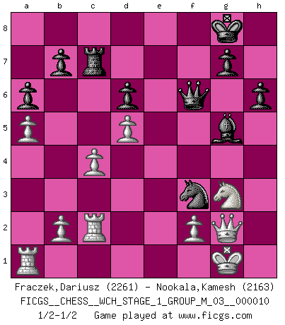 Last move : 1/2-1/2 2012 May 30 18:39:5 [Event "FICGS__CHESS__WCH_STAGE_1_GROUP_M_03__000010"] [Site "FICGS"] [Date "2012.02.02"] [Round "1"] [White "Fraczek,Dariusz"] [Black "Nookala,Kamesh"] [Result "1/2-1/2"] [WhiteElo "2261"] [BlackElo "2163"] 1.e4 c5 2.Nf3 d6 3.d4 cxd4 4.Nxd4 Nf6 5.Nc3 a6 6.Be2 e5 7.Nb3 Be7 8.O-O O-O 9.Re1 Be6 10.Bf3 Nbd7 11.a4 Rc8 12.a5 Rc4 13.Be3 Qc7 14.Qd2 h6 15.h3 Rc8 16.Rec1 Nf8 17.Qd3 Ng6 18.g3 Bxh3 19.Nd2 Rc6 20.Bd1 Qd7 21.Nd5 Nxd5 22.exd5 R6c7 23.Bb6 f5 24.Bxc7 Rxc7 25.Kh2 e4 26.Qd4 f4 27.Qxe4 Bf5 28.Qg2 Ne5 29.c4 Bg5 30.Rc3 Qe7 31.Nf1 Qf6 32.Kg1 Bg6 33.Bc2 Bxc2 34.Rxc2 fxg3 35.Nxg3 Nf3+ 1/2-1/2 Sicilian : Najdorf, Opovcensky variation Kingside Castling by player White (move 8) Kingside Castling by player Black (move 8) This chess game ended in a draw. Follow this game move after move (download)Chess is thirty to forty percent psychology. You don't have this when you play a computer. I can't confuse it. (Judith Polgar) Spielt Blackmar-Diemer-Gambit, und das Matt kommt von selbst! (Emil Joseph Diemer) El jugador blanco perdió porque fallo en recordar la coreccta continuación y tuvo que pensar por sí mismo las movidas. (Siegbert Tarrasch) Les échecs sont un jeu par leur forme, un art par leur essence et une science par sa difficulté d'acquisition. Ils peuvent vous procurer autant de plaisir qu'un bon livre ou une belle musique, mais vous n'aurez une réelle joie que si vous arrivez à bien jouer. (Tigran Petrosian) You think that education is too expensive ? Try ignorance. (Derek Bok)