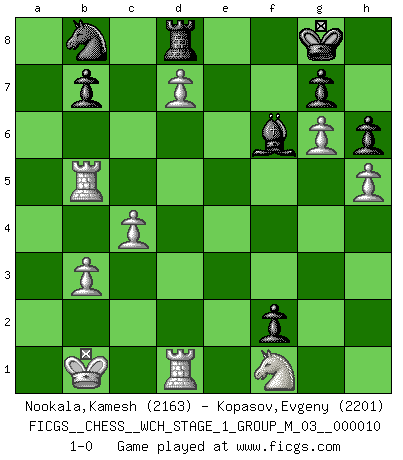 Last move : 1-0 2012 May 14 15:49:24 [Event "FICGS__CHESS__WCH_STAGE_1_GROUP_M_03__000010"] [Site "FICGS"] [Date "2012.02.02"] [Round "1"] [White "Nookala,Kamesh"] [Black "Kopasov,Evgeny"] [Result "1-0"] [WhiteElo "2163"] [BlackElo "2201"] 1.e4 c5 2.Nf3 d6 3.d4 cxd4 4.Nxd4 Nf6 5.Nc3 a6 6.Be3 e5 7.Nb3 Be6 8.f3 Be7 9.Qd2 O-O 10.O-O-O a5 11.a4 Nc6 12.g4 Nb4 13.Kb1 Rc8 14.h4 d5 15.g5 Ne8 16.exd5 Bf5 17.Na1 Nd6 18.h5 Qd7 19.Rh2 Bd8 20.Bb5 Nxb5 21.axb5 Re8 22.Ne4 Rc4 23.Qe2 Bxe4 24.fxe4 Rxe4 25.Qf3 Rc4 26.g6 f5 27.d6 f4 28.Bg1 h6 29.Qf1 Qxb5 30.b3 Rc5 31.d7 Rf8 32.Qxb5 Rxb5 33.c4 Rb6 34.Bxb6 Bxb6 35.Rd6 Bd8 36.Nc2 Nc6 37.Re6 Bg5 38.Rd2 f3 39.Rd1 Nb8 40.Ne3 e4 41.Nf1 e3 42.Rxe3 f2 43.Re5 Bf6 44.Rxa5 Rd8 45.Rb5 1-0 Sicilian : Najdorf, Byrne (English) attack Kingside Castling by player Black (move 9) Queenside Castling by player White (move 10) Player White won this chess game. Follow this game move after move (download)You can only get good at Chess if you love the game. (Bobby Fischer) Die Leute spielen gegen mich seit 15 Jahren unter Ihren Möglichkeiten. (Robert James Fischer) La última cosa en que Fischer estaba interesado era en tonterías, siempre y cuando el Ajedrez estuviera involucrado. (Elie Agur) Echiquier : carré parfait, comme la Jérusalem nouvelle décrite par l'auteur de l'Apocalypse, huit cases sur huit, exaltation du chiffre 4, symbole du cosmos aux quatre horizons... où le noir et le blanc, l'ombre et la lumière, le mal et le bien s'entremêlent et se conjuguent. (Robert Couffignal, Le Gambit du poète) The production of too many useful things results in too many useless people. (Karl Marx)