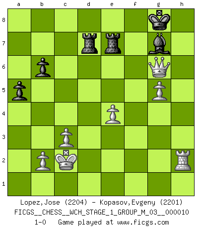 Last move : 1-0 2012 May 5 14:2:10 [Event "FICGS__CHESS__WCH_STAGE_1_GROUP_M_03__000010"] [Site "FICGS"] [Date "2012.01.01"] [Round "1"] [White "Lopez,Jose"] [Black "Kopasov,Evgeny"] [Result "1-0"] [WhiteElo "2204"] [BlackElo "2201"] 1.e4 c5 2.Nf3 d6 3.d4 cxd4 4.Nxd4 Nf6 5.Nc3 a6 6.f3 e5 7.Nb3 Be6 8.Be3 Be7 9.Qd2 O-O 10.O-O-O a5 11.a4 Nc6 12.g4 Nb4 13.Kb1 Rc8 14.g5 Nh5 15.Rg1 Qc7 16.Qf2 Nf4 17.Bxf4 exf4 18.Nd4 Qb6 19.Rg2 Qc5 20.h4 Rfd8 21.Qe1 g6 22.Nxe6 fxe6 23.Rgd2 Bf8 24.Qe2 Qe5 25.Nb5 Na6 26.Nd4 Nc5 27.Qb5 Re8 28.Bc4 Kh8 29.c3 Qg7 30.Rh1 Qf7 31.Ba2 d5 32.h5 dxe4 33.Rdh2 Kg8 34.hxg6 Qxg6 35.Ka1 Re7 36.fxe4 f3 37.Nxf3 Qe8 38.Qe2 Qxa4 39.Nd4 Rd8 40.Qf3 Bg7 41.Rxh7 Bxd4 42.Qh3 Nb3+ 43.Kb1 Nd2+ 44.Kc1 Nb3+ 45.Bxb3 Qa1+ 46.Kc2 Qxh1 47.Bxe6+ Rxe6 48.Qxh1 Bg7 49.Rh2 Rd7 50.Qf1 b6 51.Qf5 R6e7 52.Qg6 1-0 Sicilian : Najdorf Kingside Castling by player Black (move 9) Queenside Castling by player White (move 10) Player White won this chess game. Follow this game move after move (download)A bad plan is better than none at all. (Frank Marshall) Alles was am Schachbrett zählt sind gute Züge. (Robert James Fischer) Bobby solo arroja las piezas y solas caen en las casillas correctas. (Miguel Najdorf ) Vouloir jouer aux échecs contre soi-même est aussi paradoxal que vouloir marcher sur son ombre. (Stefan Zweig) Coffee just isn't my cup of tea. (Unknown)
