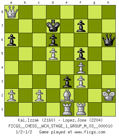 Last move : 1/2-1/2 2012 March 11 22:36:40 [Event "FICGS__CHESS__WCH_STAGE_1_GROUP_M_03__000010"] [Site "FICGS"] [Date "2012.01.01"] [Round "1"] [White "Kal,Izzak"] [Black "Lopez,Jose"] [Result "1/2-1/2"] [WhiteElo "2160"] [BlackElo "2204"] 1.e4 c5 2.Nf3 Nc6 3.d4 cxd4 4.Nxd4 Nf6 5.Nc3 e5 6.Ndb5 d6 7.Bg5 a6 8.Na3 b5 9.Bxf6 gxf6 10.Nd5 f5 11.Bd3 Be6 12.O-O Bxd5 13.exd5 Ne7 14.Nxb5 Bg7 15.Nc3 e4 16.Bc4 Ng6 17.Qh5 Bxc3 18.bxc3 Qf6 19.Qh6 Qxc3 20.Be2 Qe5 21.f3 Nf4 22.Rae1 Rg8 23.g3 Rg6 24.Qxh7 e3 25.Kh1 Qf6 26.gxf4 Rh6 27.Qg8+ Kd7 28.Qxa8 Rxh2+ 29.Kxh2 Qh6+ 1/2-1/2 Sicilian : Pelikan (Lasker/Sveshnikov) variation Kingside Castling by player White (move 12) This chess game ended in a draw. Follow this game move after move (download)The laws of Chess do not permit a free choice: you have to move whether you like it or not. (Emanuel Lasker) Karpov ist ein Museumsstück. (Garry Kasparov) El ganador de una partida es aquel jugador que hace el penúltimo error. (Savielly Tartakover) Les sacrifices démontrent seulement que quelqu'un a gaffé. (Savielly Tartacover) When the going gets tactical, the computers get going. (Hyatt)