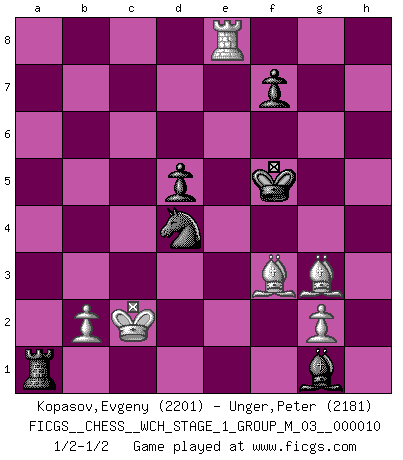 Last move : 1/2-1/2 2012 March 1 14:26:25 [Event "FICGS__CHESS__WCH_STAGE_1_GROUP_M_03__000010"] [Site "FICGS"] [Date "2012.01.01"] [Round "1"] [White "Kopasov,Evgeny"] [Black "Unger,Peter"] [Result "1/2-1/2"] [WhiteElo "2201"] [BlackElo "2181"] 1.d4 d5 2.c4 c6 3.Nf3 Nf6 4.Nc3 e6 5.Bg5 h6 6.Bh4 dxc4 7.e4 g5 8.Bg3 b5 9.Ne5 Nbd7 10.Nxc6 Qb6 11.d5 Bb7 12.a4 a6 13.Be2 Bxc6 14.dxc6 Qxc6 15.e5 Nd5 16.Nxd5 Qxd5 17.Qxd5 exd5 18.axb5 Bb4+ 19.Kd1 Nc5 20.Kc2 Ke7 21.bxa6 Nb3 22.f4 Nd4+ 23.Kd1 Bc5 24.fxg5 hxg5 25.Rf1 Rh6 26.Rf6 Rxf6 27.exf6+ Kxf6 28.Bg4 Nb3 29.Ra4 Ke7 30.Bf3 Ke6 31.h4 gxh4 32.Bxh4 Bg1 33.Rxc4 Rxa6 34.Rc8 Ra4 35.Re8+ Kf5 36.Bg3 Ra1+ 37.Kc2 Nd4+ 1/2-1/2 QGD Slav : 4.Nc3 This chess game ended in a draw. Follow this game move after move (download)Do you realize Fischer almost never has any bad pieces? He exchanges them, and the bad pieces remain with his opponents. (Yuri Balashov) Die Elozahlen sind sehr schlecht für das Schach. Jetzt ist Schach eine Sportindustrie, die darauf zielt Elopunkte zu machen. (Miguel Najdorf) No soy una persona materialista y por eso, no resiento la falta o pérdida del dinero. La ausencia de cosas mundanas carece de importancia. Ya que el Ajedrez es una forma en la que puedo ser tan materialista como yo desee sin tener la necesidad de vender mi alma. (Jamie Walter Adams) Votre prénom est 'Tactique', votre deuxième prénom est 'Tactique' et votre nom est 'Tactique'. (Ken Smith) Information on the Internet is subject to the same rules and regulations as conversation at a bar. (George Lundberg)