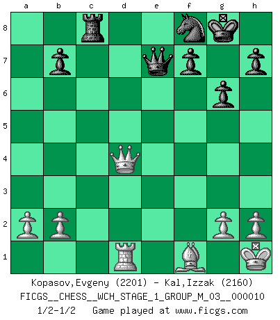 Last move : 1/2-1/2 2012 March 27 13:47:15 [Event "FICGS__CHESS__WCH_STAGE_1_GROUP_M_03__000010"] [Site "FICGS"] [Date "2012.01.01"] [Round "1"] [White "Kopasov,Evgeny"] [Black "Kal,Izzak"] [Result "1/2-1/2"] [WhiteElo "2201"] [BlackElo "2160"] 1.d4 Nf6 2.c4 g6 3.Nc3 Bg7 4.e4 d6 5.Nf3 O-O 6.Be2 e5 7.O-O exd4 8.Nxd4 Re8 9.f3 Nc6 10.Be3 Nh5 11.Qd2 Nf4 12.Rfd1 Nxd4 13.Bxd4 Bxd4+ 14.Qxd4 a5 15.Qd2 Ne6 16.f4 Bd7 17.e5 Bc6 18.Nd5 dxe5 19.fxe5 Bxd5 20.cxd5 Ng7 21.Qc3 c6 22.dxc6 Qb6+ 23.Kh1 Qxc6 24.Bc4 a4 25.Rd6 Qc7 26.Rad1 Re7 27.R6d5 Ne6 28.Qa3 Rc8 29.Bf1 Nf8 30.Qxa4 Rxe5 31.Rxe5 Qxe5 32.Qd4 Qe7 1/2-1/2 King's Indian : Orthodox variation Kingside Castling by player Black (move 5) Kingside Castling by player White (move 7) This chess game ended in a draw. Follow this game move after move (download)The older I grow, the more I value pawns. (Paul Keres) Rauchen ist dem Schachspieler bei seiner Arbeit, also im Wettkampf, untersagt. (Viktor Kortschnoi) La última cosa en que Fischer estaba interesado era en tonterías, siempre y cuando el Ajedrez estuviera involucrado. (Elie Agur) Karpov est une pièce de musée. (Garry Kasparov) Luck never made a man wise. (Seneca, Letters to Lucilius)