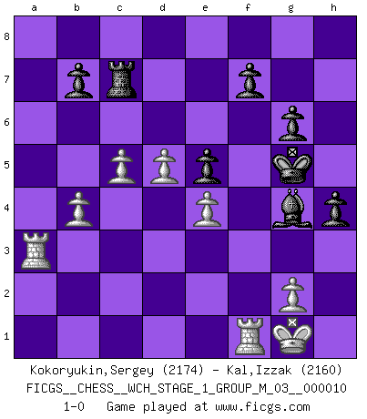 Last move : 1-0 2012 May 2 2:16:37 [Event "FICGS__CHESS__WCH_STAGE_1_GROUP_M_03__000010"] [Site "FICGS"] [Date "2012.01.01"] [Round "1"] [White "Kokoryukin,Sergey"] [Black "Kal,Izzak"] [Result "1-0"] [WhiteElo "2174"] [BlackElo "2160"] 1.d4 Nf6 2.c4 g6 3.Nc3 Bg7 4.Nf3 O-O 5.e4 d6 6.h3 e5 7.d5 a5 8.Bg5 Nbd7 9.Be2 Nc5 10.Nd2 Bd7 11.b3 c6 12.O-O Qc7 13.Be3 Rfc8 14.a3 cxd5 15.exd5 Na6 16.Bg4 Nxg4 17.hxg4 Nc5 18.Bxc5 Qxc5 19.Nde4 Qb6 20.Rc1 Rd8 21.g5 h5 22.Re1 Bf5 23.Nf6+ Bxf6 24.gxf6 Rd7 25.Na4 Qd8 26.Qd2 Rc7 27.Qg5 Rb8 28.Nb6 e4 29.Re3 Qf8 30.Rce1 Re8 31.f3 Re5 32.Qf4 Kh7 33.b4 axb4 34.fxe4 Bg4 35.axb4 Qh6 36.Qh2 Qg5 37.c5 h4 38.Nc4 Qxf6 39.Rf1 Qg5 40.Qf4 Kh6 41.Qxg5+ Kxg5 42.Nxe5 dxe5 43.Ra3 1-0 King's Indian defense, 3.Nc3 Kingside Castling by player Black (move 4) Kingside Castling by player White (move 12) Player White won this chess game. Follow this game move after move (download)Man is a frivolous, a specious creature, and like a Chess player, cares more for the process of attaining his goal than for the goal itself. (Dostoyevsky) Kasparov stellt für gewöhnlich die Regeln auf und bricht sie dann selbst wieder. (Alexej Shirov) Hay jugadores fuertes y personas amables y yo soy un jugador fuerte. (Bobby Fischer) Le joueur d'Echecs qui veut atteindre le top est obligé de développer son propre credo créatif. Alexeï Stepanovicth Souétine. Il est facile d'écrire des livres ! Ce qui est difficile, c'est de jouer ! (Alexeï Stepanovicth Souétine) Whatever you do, don't be bored. This is absolutely the most exciting time we could have possibly hoped to be alive. And things are just starting. (From movie Waking life)