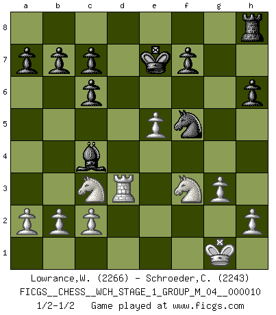 Last move : 1/2-1/2 2012 February 8 1:32:56 [Event "FICGS__CHESS__WCH_STAGE_1_GROUP_M_04__000010"] [Site "FICGS"] [Date "2012.01.01"] [Round "1"] [White "Lowrance,Wayne"] [Black "Schroeder,Christoph"] [Result "1/2-1/2"] [WhiteElo "2266"] [BlackElo "2243"] 1.e4 e5 2.Nf3 Nc6 3.Bb5 Nf6 4.O-O Nxe4 5.d4 Nd6 6.Bxc6 dxc6 7.dxe5 Nf5 8.Qxd8+ Kxd8 9.Rd1+ Ke8 10.Nc3 Be7 11.Bg5 Bxg5 12.Nxg5 h6 13.Nf3 Be6 14.Rd3 Rd8 15.Rad1 Rxd3 16.Rxd3 g5 17.g3 g4 18.Nd2 Ke7 19.f4 gxf3 20.Nxf3 Bc4 1/2-1/2 Ruy Lopez : Berlin defense, Open variation Kingside Castling by player White (move 4) This chess game ended in a draw. Follow this game move after move (download)Checkers is for tramps. (Paul Morphy) Um sich vor der Gefahr einer Erkältung zu schützen, sorge der wanderlustige König beizeiten für ein brauchbares Versteck. (Aaron Nimzowitsch) ¿Cual es el objetivo de jugar una apertura de gambito?... Para adquirir una reputación de ser un jugador apuesto a costo de perder el juego. (Siegbert Tarrasch) Le système Elo représente seulement une moyenne. Il est simplement un indicateur de votre stabilité. (Anatoli Karpov) The good fighters of old first put themselves beyond the possibility of defeat, and then waited for an opportunity of defeating the enemy. (Sun Tzu)