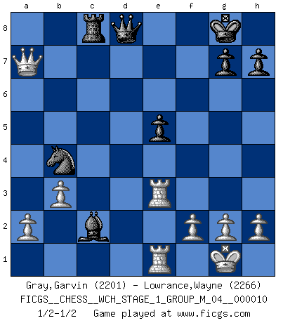 Last move : 1/2-1/2 2012 March 24 17:31:58 [Event "FICGS__CHESS__WCH_STAGE_1_GROUP_M_04__000010"] [Site "FICGS"] [Date "2012.01.01"] [Round "1"] [White "Gray,Garvin"] [Black "Lowrance,Wayne"] [Result "1/2-1/2"] [WhiteElo "2201"] [BlackElo "2266"] 1.e4 e5 2.Nf3 Nc6 3.Bc4 Nf6 4.Ng5 d5 5.exd5 Na5 6.Bb5+ c6 7.dxc6 bxc6 8.Bd3 Nd5 9.Nf3 Bd6 10.O-O Nf4 11.Nc3 Nxd3 12.cxd3 O-O 13.Ne4 Bc7 14.Qc2 c5 15.Qxc5 Ba6 16.Re1 Bxd3 17.b3 Re8 18.Qc3 Bb6 19.Nc5 Bxc5 20.Qxc5 Rc8 21.Qe3 Nc6 22.Bb2 Nb4 23.Nxe5 f6 24.Qxa7 Rxe5 25.Bxe5 fxe5 26.Rac1 Bc2 27.Re3 Qxd2 28.Rce1 Qd8 1/2-1/2 Two knights defense Kingside Castling by player White (move 10) Kingside Castling by player Black (move 12) This chess game ended in a draw. Follow this game move after move (download)Chess is everything: art, science and sport. (Anatoly Karpov) Ein Springer auf f6 gegen die eigene Rochadestellung ist schlimmer als ein rostiger Nagel im Knie. (Efim Bogoljubov) Fischer es el jugador mas fuerte del mundo. De hecho, el jugador mas fuerte que jamas haya existido. (Larry Evans) On entre au jeu d'Echecs comme on entre en Religion. Pour le joueur d'Echecs, la partie d'Echecs c'est l'office, la messe, le défilé du 1er Mai, le dépôt de gerbe au Monument aux Morts. C'est un drame sacré. (Michel Roos) The leaves of memory seemed to make a mournful rustling in the dark. (Henry Wadsworth Longfellow)