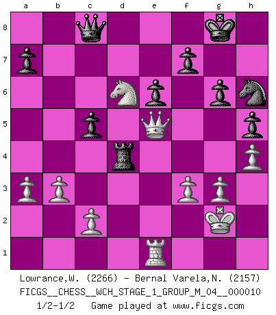 Last move : 1/2-1/2 2012 April 15 4:15:40 [Event "FICGS__CHESS__WCH_STAGE_1_GROUP_M_04__000010"] [Site "FICGS"] [Date "2012.01.01"] [Round "1"] [White "Lowrance,Wayne"] [Black "Bernal Varela,Nelson"] [Result "1/2-1/2"] [WhiteElo "2266"] [BlackElo "2157"] 1.e4 c5 2.Nf3 d6 3.Bb5+ Bd7 4.Bxd7+ Qxd7 5.O-O Nf6 6.e5 dxe5 7.Nxe5 Qc7 8.d4 cxd4 9.Qxd4 e6 10.Qa4+ Nc6 11.Nxc6 bxc6 12.Bf4 Bd6 13.Bxd6 Qxd6 14.Na3 O-O 15.Rad1 Qc7 16.Nc4 Rab8 17.Qa3 Rb5 18.Qf3 Rd5 19.Ne3 Ra5 20.a3 h6 21.g3 Rb8 22.Qe2 Rg5 23.Nc4 Rd5 24.Rfe1 c5 25.Rd2 h5 26.h4 Rxd2 27.Qxd2 Rd8 28.Qe2 Ng4 29.b3 g6 30.Kg2 Rd4 31.f3 Nh6 32.Qe5 Qc8 33.Nd6 1/2-1/2 Sicilian : Canal-Sokolsky attack, 3...Bd7 Kingside Castling by player White (move 5) Kingside Castling by player Black (move 14) This chess game ended in a draw. Follow this game move after move (download)Fischer was a master of clarity and a king of artful positioning. His opponents would see where he was going but were powerless to stop him. (Bruce Pandolfini) Wir irren allesamt, nur jeder irrt anders. (Georg Christoph Lichtenberg) Prefiero perder una partida realmente buena, que ganar una mala. (David Levy) Votre prénom est 'Tactique', votre deuxième prénom est 'Tactique' et votre nom est 'Tactique'. (Ken Smith) Art is the only way to run away without leaving home. (Twyla Tharp)