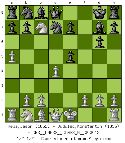 Last move : 1/2-1/2 2007 January 25 6:59:14 [Event "FICGS__CHESS__CLASS_B__000013"] [Site "FICGS"] [Date "2007.01.13"] [Round "1"] [White "Repa,Jason"] [Black "Dudulec,Konstantin"] [Result "1/2-1/2"] [WhiteElo "1862"] [BlackElo "1835"] 1.e4 Nf6 2.e5 Nd5 3.d4 d6 4.Nf3 g6 5.Bc4 Nb6 6.Bb3 Bg7 7.a4 dxe5 8.a5 N6d7 9.Bxf7+ Kxf7 10.Ng5+ Kg8 11.Ne6 Qe8 12.Nxc7 Qd8 13.Ne6 Qe8 14.Nc7 Qd8 15.Ne6 Qe8 16.Nc7 Qd8 1/2-1/2 Alekhine's defense : Modern, Keres variation This chess game ended in a draw. Follow this game move after move (download)Examine moves that smite! A good eye for smites is far more important than a knowledge of strategical principles. (Purdy) Es tut gut, die Entwicklungsperiode von, [...] demokratischem Geist durchdringen zu lassen. Wie undemokratisch wäre es doch beispielsweise, den einen Offizier große Spaziertouren vornehmen zu lassen, während die anderen zu Hause säßen und sich entsetzlich langweilten. (Aaron Nimzowitsch) Si el Ajedrez es una ciencia, es la mas inexacta. Si el Ajedrez es un arte, es demasiado inexacto para ser visto como tal. Si el Ajedrez es un deporte, es demasiado esotérico. Si el Ajedrez es un juego, es demasiado exigente para ser solo un juego. Si el Ajedrez es una aventura, es una muy demandante. Si el Ajedrez es una pasión, es una muy gratificante. Si el Ajedrez es la vida, es una muy triste. (Anónimo) Les échecs, c'est l'imagination. (David Bronstein) The existence of forgetting has never been proved: We only know that some things don't come to mind when we want them. (Friedrich Nietzsche)