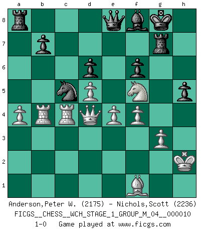 Last move : 1-0 2012 January 22 19:25:46 [Event "FICGS__CHESS__WCH_STAGE_1_GROUP_M_04__000010"] [Site "FICGS"] [Date "2012.01.01"] [Round "1"] [White "Anderson,Peter W."] [Black "Nichols,Scott"] [Result "1-0"] [WhiteElo "2175"] [BlackElo "2236"] 1.d4 Nf6 2.c4 g6 3.Nc3 Bg7 4.e4 d6 5.Nf3 O-O 6.Be2 e5 7.Be3 exd4 8.Nxd4 Re8 9.f3 c6 10.Bf2 Bh6 11.Nc2 Be6 12.O-O Nh5 13.g3 Nf6 14.Qd4 c5 15.Qd3 Nc6 16.Rfd1 Bf8 17.Qd2 a6 18.Rab1 Qc7 19.Nd5 Bxd5 20.cxd5 Ne5 21.b4 c4 22.Nd4 Qd7 23.b5 Qh3 24.Qc2 Nfd7 25.Bf1 Qh6 26.Kg2 axb5 27.Be2 Nc5 28.Nxb5 Rac8 29.Bg1 g5 30.Bxc5 Rxc5 31.Nd4 Rc7 32.Nf5 Qf6 33.Rb4 Rec8 34.a4 h6 35.Qc3 h5 36.Rc1 g4 37.f4 Nd7 38.Qc2 Nc5 39.Rxc4 Re8 40.Nh4 Qg7 41.Bf1 Qf6 42.Rb1 Qd8 43.h3 gxh3+ 44.Kxh3 Qd7+ 45.Kh2 Ra8 46.R1b4 Qe8 47.Qd1 f6 48.Qd4 Rg7 49.Nf5 1-0 King's Indian : Gligoric-Taimanov system Kingside Castling by player Black (move 5) Kingside Castling by player White (move 12) Player White won this chess game. Follow this game move after move (download)War is the child of passion, passion is the child of narcissism and narcissism is the child. (...) Another game ? (Thibault de Vassal) Meine Liebe ist Schach, Schach, Schach. Ich muss jeden Tag Schach spielen, deshalb fühle ich mich so stark. (Miguel Najdorf) Cuando veas una buena jugada, trata de encontrar otra mejor. (Emanuel Lasker) La guerre est enfant de la passion, la passion est enfant du narcissisme et le narcissisme est l'enfant. (...) Une autre partie ? (Thibault de Vassal) They say poker is a zero-sum game. It must be, because every time I play my sum ends up zero. (Max Shapiro)