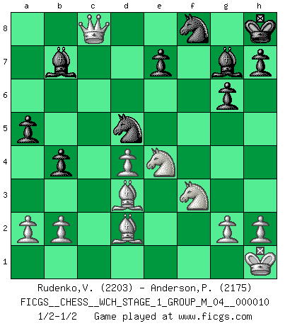 Last move : 1/2-1/2 2012 February 3 18:13:17 [Event "FICGS__CHESS__WCH_STAGE_1_GROUP_M_04__000010"] [Site "FICGS"] [Date "2012.01.01"] [Round "1"] [White "Rudenko,Vitaly"] [Black "Anderson,Peter W."] [Result "1/2-1/2"] [WhiteElo "2203"] [BlackElo "2175"] 1.e4 g6 2.d4 Bg7 3.Nc3 d6 4.f4 a6 5.Be3 b5 6.Bd3 Bb7 7.Nf3 b4 8.Ne2 Nf6 9.Ng3 Nbd7 10.c3 c5 11.Qe2 O-O 12.O-O a5 13.Kh1 Rc8 14.Rac1 cxd4 15.cxd4 Rxc1 16.Rxc1 Qa8 17.Bd2 Rc8 18.Rxc8+ Qxc8 19.e5 dxe5 20.fxe5 Nd5 21.e6 fxe6 22.Qxe6+ Kh8 23.Ne4 Nf8 24.Qxc8 1/2-1/2 Robatsch defense : Pseudo-Austrian attack Kingside Castling by player Black (move 11) Kingside Castling by player White (move 12) This chess game ended in a draw. Follow this game move after move (download)At this time Fischer is simply a level above all the best Chessplayers in the world. (John Jacobs) Ich bin stolz ein Bulgare zu sein. (Veselin Topalov) Una buena memoria, concentración, imaginación y una fuerte voluntad, se requiere para llegar a ser un buen jugador. (Bobby Fischer) Le système Elo représente seulement une moyenne. Il est simplement un indicateur de votre stabilité. (Anatoli Karpov) If everyone is thinking alike, then somebody isn't thinking. (US General George S. Patton)