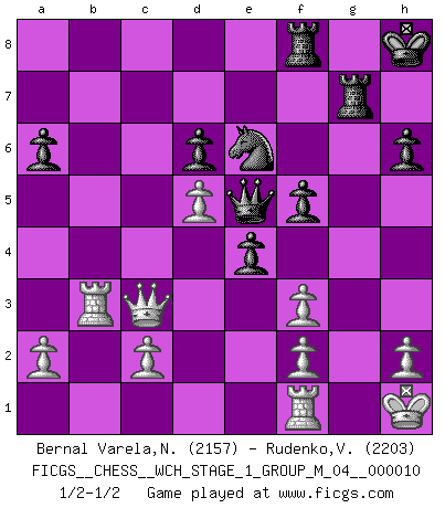 Last move : 1/2-1/2 2012 March 2 4:54:21 [Event "FICGS__CHESS__WCH_STAGE_1_GROUP_M_04__000010"] [Site "FICGS"] [Date "2012.01.01"] [Round "1"] [White "Bernal Varela,Nelson"] [Black "Rudenko,Vitaly"] [Result "1/2-1/2"] [WhiteElo "2157"] [BlackElo "2203"] 1.e4 c5 2.Nf3 Nc6 3.d4 cxd4 4.Nxd4 Nf6 5.Nc3 e5 6.Ndb5 d6 7.Bg5 a6 8.Na3 b5 9.Bxf6 gxf6 10.Nd5 f5 11.Bd3 Be6 12.O-O Bxd5 13.exd5 Ne7 14.Nxb5 Bg7 15.Nc3 e4 16.Bc4 O-O 17.Qh5 Qc7 18.Bb3 Bxc3 19.bxc3 f4 20.Ba4 Qxc3 21.Rae1 f5 22.Qg5+ Ng6 23.Bd7 Qe5 24.Be6+ Kh8 25.Rb1 Ra7 26.Rb3 f3 27.gxf3 Rg7 28.Kh1 h6 29.Qe3 Nf4 30.Qc3 Nxe6 1/2-1/2 Sicilian : Pelikan (Lasker/Sveshnikov) variation Kingside Castling by player White (move 12) Kingside Castling by player Black (move 16) This chess game ended in a draw. Follow this game move after move (download)I still hope to kill Fischer. (Boris Spassky) Kasparov stellt für gewöhnlich die Regeln auf und bricht sie dann selbst wieder. (Alexej Shirov) Cuando tengo las piezas blancas, yo gano porque soy blanco; Cuando tengo las piezas negras, yo gano porque soy Bogolyubov. (Bogolyubov) Dans le domaine de la peinture, de la gravure et de la sculpture, dès la première décennie de notre siècle, les artistes abandonnent la représentation de la partie d'échecs pour se concentrer sur les pièces, sur les échiquiers et sur toutes les variations auxquelles les unes et les autres peuvent donner lieu. On passe en quelque sorte d'un thème social à un thème musical (au sens de la musica médiévale, c'est-à-dire d'une notion qui inclue le rythme, l'harmonie, la construction et la déconstruction, etc.). Graphiquement et picturalement, l'échiquier apparaît comme une structure ouverte, dynamique, d'une richesse infinie, autorisant toutes les combinatoires et débouchant sur des mouvements et des rythmes de nature exponentielle. (Michel Pastoureau) Those parts of the system that you can hit with a hammer (not advised) are called hardware; those program instructions that you can only curse at are called software. (Anonymous)
