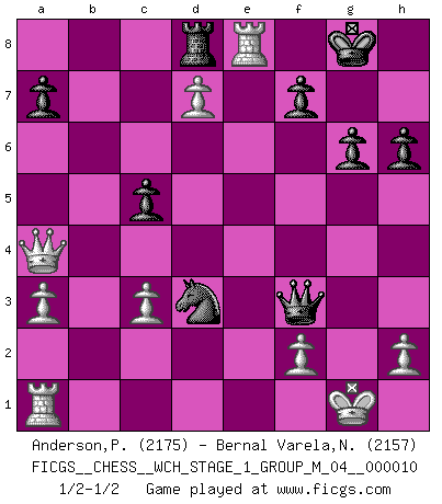 Last move : 1/2-1/2 2012 March 10 5:36:17 [Event "FICGS__CHESS__WCH_STAGE_1_GROUP_M_04__000010"] [Site "FICGS"] [Date "2012.01.01"] [Round "1"] [White "Anderson,Peter W."] [Black "Bernal Varela,Nelson"] [Result "1/2-1/2"] [WhiteElo "2175"] [BlackElo "2157"] 1.d4 Nf6 2.c4 g6 3.Nc3 d5 4.Nf3 Bg7 5.Qb3 dxc4 6.Qxc4 O-O 7.e4 Na6 8.Be2 c5 9.d5 e6 10.O-O exd5 11.exd5 Re8 12.Rd1 Bf5 13.d6 h6 14.Bf4 Nd7 15.a3 Bxc3 16.bxc3 Re4 17.Qb5 Rxf4 18.Qxb7 Be4 19.Qxa6 Qf6 20.Qa5 Bxf3 21.Bxf3 Rxf3 22.gxf3 Qxf3 23.Qa4 Ne5 24.d7 Rd8 25.Re1 Nd3 26.Re8+ 1/2-1/2 King's Indian defense, 3.Nc3 Kingside Castling by player Black (move 6) Kingside Castling by player White (move 10) This chess game ended in a draw. Follow this game move after move (download)I had a toothache during the first game. In the second game I had a headache. In the third game it was an attack of rheumatism. In the fourth game, I wasn't feeling well. And in the fifth game? Well, must one have to win every game ? (Siegbert Tarrasch) Die Neutralität betrachte ich als eine schwere Krankheit. (Viktor Kortschnoi) Debemos de asegurarnos de que el Ajedrez no se convierta en un lenguaje muerto, muy interesante, pero tan solo para un grupo muy pequeño. (Sytze Faber) Si le désir cupide (et stupide) de gagner est une inépuisable source de souffrance, une combinaison brillante sur l'échiquier est une découverte : le coquelicot qui s'épanouit lorsque apparaît la Voie Lactée. (Arrabal) Lottery : A tax on people who are bad at math. (Author unknown)