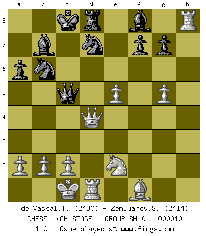 Last move : 1-0 2012 May 5 0:44:45 [Event "FICGS__CHESS__WCH_STAGE_1_GROUP_SM_01__000010"] [Site "FICGS"] [Date "2012.01.01"] [Round "1"] [White "de Vassal,Thibault"] [Black "Zemlyanov,Sergey"] [Result "1-0"] [WhiteElo "2430"] [BlackElo "2414"] 1.e4 c5 2.Nf3 d6 3.d4 cxd4 4.Nxd4 Nf6 5.Nc3 a6 6.f3 e6 7.Be3 b5 8.Qd2 Nbd7 9.g4 b4 10.Nce2 h6 11.O-O-O Qc7 12.h4 d5 13.Bf4 e5 14.Bh2 dxe4 15.g5 hxg5 16.hxg5 Rxh2 17.Rxh2 exd4 18.Rh8 Nd5 19.Qxd4 Bb7 20.fxe4 N5b6 21.Qxb4 O-O-O 22.Qd4 Qc5 23.e5 1-0 This chess game has been lost on time (started : 2012.01.01 23:53:52) Sicilian : Najdorf Queenside Castling by player White (move 11) Queenside Castling by player Black (move 21) Player White won this chess game. Follow this game move after move (download)Chess is a beautiful mistress. (Bent Larsen) Ein Kibitz ist einer, der deinem Gegner gute Ratschläge gibt. (Andrew Soltis) Yo nunca en mi vida he jugado la Defensa Francesa, que viene siendo la más aburrida de todas las Aperturas. (Wilhelm Steinitz) Fischer est le meilleur joueur du monde et Karpov n'est qu'un joueur de bistrot. (Garry Kasparov, agé de 16 ans) A good book on your shelf is a friend that turns its back on you and remains a friend. (Author unknown)