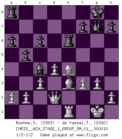 Last move : 1/2-1/2 2012 June 8 23:58:17 [Event "FICGS__CHESS__WCH_STAGE_1_GROUP_SM_01__000010"] [Site "FICGS"] [Date "2012.01.01"] [Round "1"] [White "Boehme,Sebastian"] [Black "de Vassal,Thibault"] [Result "1/2-1/2"] [WhiteElo "2369"] [BlackElo "2430"] 1.e4 e5 2.Nf3 Nc6 3.Bb5 a6 4.Ba4 Nf6 5.O-O Be7 6.Re1 b5 7.Bb3 O-O 8.c3 d5 9.exd5 Nxd5 10.Nxe5 Nxe5 11.Rxe5 c6 12.d4 Bd6 13.Re1 Qh4 14.g3 Qh3 15.Re4 g5 16.Qf1 Qh5 17.f3 Bf5 18.Nd2 Nf6 19.Qg2 Nxe4 20.Nxe4 Qg6 21.Nxd6 Qxd6 22.Bxg5 Qg6 23.Bf4 Rfe8 24.Qd2 Bd3 25.Rd1 Be2 26.Bc2 Qg7 27.Bh6 Qf6 28.Re1 Bc4 29.Be4 Re6 30.Bg5 Qg7 31.Be3 1/2-1/2 Ruy Lopez : Closed, 7...O-O Kingside Castling by player White (move 5) Kingside Castling by player Black (move 7) This chess game ended in a draw. Follow this game move after move (download)Chess holds its master in its own bonds, shackling the mind and brain so that the inner freedom of the very strongest must suffer. (Albert Einstein) Wie kann ich Remis annehmen? Ich weiß ja gar nicht, wie ich stehe! (Fritz Sämisch) Nada excita más a Grandes Maestros aburridos que una novedad teórica. (Dominic Lawson) Vous n'êtes pas toujours obligé de jouer le meilleur coup. Un coup doit être actif, entreprenant, correct et beau ! (David Bronstein) O divine art of subtlety and secrecy! Through you we learn to be invisible, through you inaudible and hence we can hold the enemy's fate in our hands. (Sun Tzu)