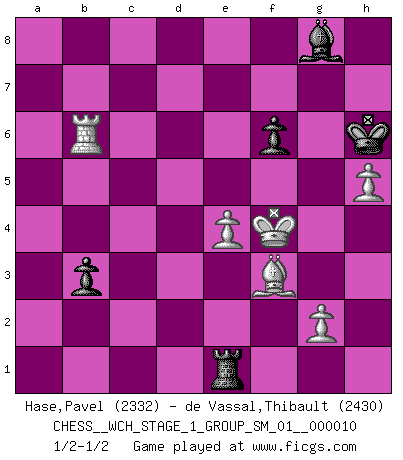 Last move : 1/2-1/2 2012 October 23 12:27:33 [Event "FICGS__CHESS__WCH_STAGE_1_GROUP_SM_01__000010"] [Site "FICGS"] [Date "2012.01.01"] [Round "1"] [White "Hase,Pavel"] [Black "de Vassal,Thibault"] [Result "1/2-1/2"] [WhiteElo "2332"] [BlackElo "2430"] 1.e4 e5 2.Nf3 Nc6 3.Bb5 a6 4.Ba4 Nf6 5.O-O Be7 6.Re1 b5 7.Bb3 O-O 8.c3 d6 9.h3 Na5 10.Bc2 c5 11.d4 Nd7 12.Nbd2 exd4 13.cxd4 Nc6 14.d5 Nce5 15.a4 Bb7 16.Qe2 c4 17.Nxe5 Nxe5 18.Nf1 Re8 19.Be3 Bf6 20.axb5 axb5 21.Qd2 Qd7 22.Ng3 g6 23.Ne2 c3 24.Nxc3 Nc4 25.Qe2 Nxe3 26.Qxe3 Qc7 27.Rac1 Qb8 28.Bd3 Bxc3 29.Rxc3 Bxd5 30.Qd4 Qb7 31.h4 b4 32.R3c1 Be6 33.Bf1 h5 34.Qxd6 Red8 35.Qg3 Rd4 36.Rc5 Qd7 37.Rg5 Kh7 38.f4 Qd6 39.Kh2 Rd2 40.Be2 Rxb2 41.Rd1 Rd2 42.Rxd2 Qxd2 43.Bxh5 Ra1 44.f5 Qc1 45.fxg6+ Kh6 46.Qf2 f6 47.Rb5 b3 48.g7 Qh1+ 49.Kg3 Qe1 50.Qxe1 Rxe1 51.g8Q Bxg8 52.Bf3 Bc4 53.Rb6 Kg7 54.Kg4 Be6+ 55.Kf4 Kf7 56.Rb7+ Kg6 57.h5+ Kh6 58.Rb6 Kg7 59.Kg3 Bc4 60.Kg4 Bg8 61.Kf5 Bh7+ 62.Kf4 Bg8 63.Rb7+ Kh6 64.Rb6 1/2-1/2 Ruy Lopez : Closed, 7...O-O Kingside Castling by player White (move 5) Kingside Castling by player Black (move 7) Promotion Queen by player White (move 51) This chess game ended in a draw. Follow this game move after move (download)Whoever sees no other aim in the game than that of giving checkmate to one's opponent will never become a good Chess player. (Euwe) Wenn ich Weiß habe gewinne ich weil ich Weiß habe, wenn ich Schwarz habe gewinne ich weil ich Bogoljubov bin. (Efim Bogoljubov) Si no le temes a Spassky, entonces elimino el elemento del dinero. (Jim Slater) Que feriez-vous si vous étiez en train de jouer aux échecs et que la fin du monde arrive ? Je continuerais à jouer. (Saint Borromée) Always remember that you are unique; just like everyone else. (Unknown)