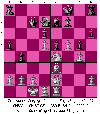 Last move : 0-1 2012 April 13 11:37:20 [Event "FICGS__CHESS__WCH_STAGE_1_GROUP_SM_01__000010"] [Site "FICGS"] [Date "2012.01.01"] [Round "1"] [White "Zemlyanov,Sergey"] [Black "Fajs,Bojan"] [Result "0-1"] [WhiteElo "2414"] [BlackElo "2410"] 1.e4 c5 2.Nf3 d6 3.d4 cxd4 4.Nxd4 Nf6 5.Nc3 a6 6.Be3 e6 7.Be2 Nbd7 8.g4 h6 9.f4 g5 10.f5 e5 11.Nb3 b5 12.Qd3 Bb7 13.O-O-O b4 14.Nd5 Nxd5 15.exd5 a5 16.Rhe1 Ba6 17.Qd2 Bxe2 18.Qxe2 Be7 19.Nd2 Qc7 20.Ne4 Kf8 0-1 This chess game has been lost on time (started : 2012.01.01 23:53:52) Sicilian : Najdorf, Byrne (English) attack Queenside Castling by player White (move 13) Player Black won this chess game. Follow this game move after move (download)Chess, like any creative activity, can exist only through the combined efforts of those who have creative talent, and those who have the ability to organize their creative work. (Mikhail Botvinnik) Ein Buch ist ein Spiegel; wenn ein Affe hineinsieht, so kann kein Apostel heraus gucken. (Georg Christoph Lichtenberg) Después de la respuesta de las negras a 1.e4 con 1..e5, se quedan siempre tratando de entrar dentro del juego. (Howard Staunton) Karpov est une pièce de musée. (Garry Kasparov) It is the aim of the modern school, not to treat every position according to one general law, but according to the principle inherent in the position. (Richard Reti)