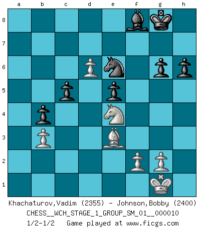 Last move : 1/2-1/2 2012 February 15 23:38:3 [Event "FICGS__CHESS__WCH_STAGE_1_GROUP_SM_01__000010"] [Site "FICGS"] [Date "2012.01.01"] [Round "1"] [White "Khachaturov,Vadim"] [Black "Johnson,Bobby"] [Result "1/2-1/2"] [WhiteElo "2355"] [BlackElo "2400"] 1.e4 e5 2.Nf3 Nc6 3.Bb5 a6 4.Ba4 Nf6 5.O-O Be7 6.Re1 b5 7.Bb3 d6 8.c3 O-O 9.h3 Bb7 10.d4 Re8 11.Nbd2 Bf8 12.a4 exd4 13.cxd4 h6 14.Bc2 Nb4 15.Bb1 c5 16.d5 g6 17.Nf1 Bg7 18.axb5 axb5 19.Rxa8 Qxa8 20.Bf4 Qd8 21.Ng3 Kh7 22.Bd2 Na6 23.b3 b4 24.h4 Nc7 25.h5 Ng4 26.hxg6+ fxg6 27.e5 Nxe5 28.Nxe5 Rxe5 29.Rxe5 dxe5 30.Qg4 Qe8 31.d6 Qe6 32.Qxe6 Nxe6 33.Be4 Bxe4 34.Nxe4 Kg8 35.Be3 Bf8 1/2-1/2 Ruy Lopez : Closed Kingside Castling by player White (move 5) Kingside Castling by player Black (move 8) This chess game ended in a draw. Follow this game move after move (download)I am the best player in the world and I am here to prove it. (Bobby Fischer) Ich habe Kasparov in Rente geschickt. (Veselin Topalov) Entre mas años cumplo, mas valoro los Peones. (Keres) Roi des jeux et jeu des rois, les échecs portent en eux un sentiment d'infini. Ils donnent à celui qui s'est efforcé d'en approfondir les arcanes l'impression de n'être pas à la mesure de l'homme; en fait, ils constituent un résumé de l'univers, un microcosme, et figurent cette grande échelle qui, dans les plans de la lumière descend jusqu'à la matière, qui des abîmes insondables remonte jusqu'en l'infini de Dieu. (Pyrame) There are two kinds of tragedy in this world, one is not getting what you want and the other is getting. (Lord of war)