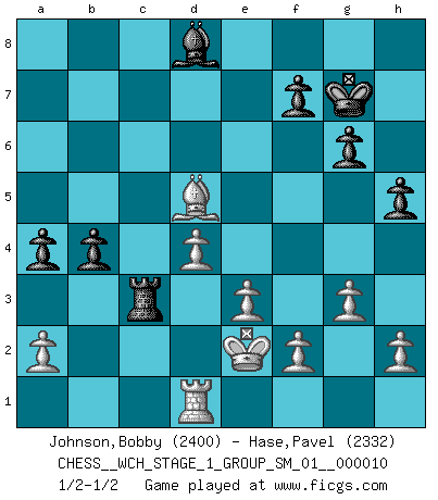 Last move : 1/2-1/2 2012 March 3 23:34:15 [Event "FICGS__CHESS__WCH_STAGE_1_GROUP_SM_01__000010"] [Site "FICGS"] [Date "2012.01.01"] [Round "1"] [White "Johnson,Bobby"] [Black "Hase,Pavel"] [Result "1/2-1/2"] [WhiteElo "2400"] [BlackElo "2332"] 1.d4 d5 2.c4 e6 3.Nf3 Nf6 4.g3 c5 5.cxd5 exd5 6.Bg2 Nc6 7.O-O Be7 8.Nc3 c4 9.b3 cxb3 10.Qxb3 O-O 11.Bf4 Na5 12.Qb1 Bd7 13.Qd3 Rc8 14.Rfc1 Re8 15.Be5 Bc6 16.Nb5 Bxb5 17.Qxb5 Rc4 18.Bxf6 Bxf6 19.e3 a6 20.Qb2 Ra4 21.Ne1 b5 22.Qc2 Nc4 23.Qf5 Nb6 24.Nd3 g6 25.Qf3 Ra3 26.Nb4 Kg7 27.Rd1 a5 28.Nxd5 b4 29.Kf1 h5 30.Nxb6 Qxb6 31.Qc6 Qxc6 32.Bxc6 Rc8 33.Bd5 a4 34.Rac1 Rac3 35.Rxc3 Rxc3 36.Ke2 Bd8 1/2-1/2 Queen's gambit declined Kingside Castling by player White (move 7) Kingside Castling by player Black (move 10) This chess game ended in a draw. Follow this game move after move (download)The chessboard is the world, the pieces are the phenomena of the Universe, the rules of the game are what we call the laws of Nature and the player on the other side is hidden from us. (Thomas Huxley) Schach ist gnadenlos. Du mußt bereit sein zu töten. (Nigel Short) Cuando tengo las piezas blancas, yo gano porque soy blanco; Cuando tengo las piezas negras, yo gano porque soy Bogolyubov. (Bogolyubov) Tout change constamment, y compris dans le monde des Echecs. (Botvinnik) Strategy without tactics is the slowest route to victory. Tactics without strategy is the noise before defeat. (Sun Tzu)
