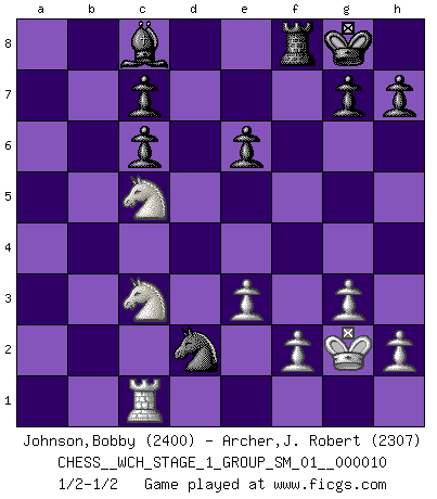 Last move : 1/2-1/2 2012 March 23 15:19:40 [Event "FICGS__CHESS__WCH_STAGE_1_GROUP_SM_01__000010"] [Site "FICGS"] [Date "2012.01.01"] [Round "1"] [White "Johnson,Bobby"] [Black "Archer,J. Robert"] [Result "1/2-1/2"] [WhiteElo "2400"] [BlackElo "2307"] 1.d4 Nf6 2.Nf3 d5 3.c4 e6 4.g3 dxc4 5.Bg2 Nc6 6.Qa4 Bb4+ 7.Bd2 Nd5 8.Bxb4 Ndxb4 9.Nc3 Bd7 10.O-O a5 11.Qd1 Nd5 12.e3 Nb6 13.Nd2 a4 14.b3 axb3 15.axb3 cxb3 16.Nxb3 O-O 17.Nc5 Rxa1 18.Qxa1 Bc8 19.Rc1 e5 20.Bxc6 bxc6 21.dxe5 Nc4 22.e6 fxe6 23.Qa2 Qd2 24.Qxd2 Nxd2 25.Kg2 1/2-1/2 Queen's pawn game Kingside Castling by player White (move 10) Kingside Castling by player Black (move 16) This chess game ended in a draw. Follow this game move after move (download)It began to feel as though you were playing against Chess itself. - On playing against Robert Fischer. (Walter Shipman) Nach Morphy wurde nichts neues mehr in der Behandlung offener Positionen gefunden. (Mikhail Moiseyevich Botvinik) El Ajedrez es un expediente tonto que hace creer a la gente inactiva que hacen una cosa muy astuta cuando solamente estan perdiendo su tiempo. (George Bernard Shaw) Il s'avisa de me proposer d'apprendre les échecs qu'il jouait un peu... me voilà forcené des échecs. J'achète un échiquier, je m'enferme dans ma chambre, j'y passe des jours et des nuits à vouloir apprendre par cœur toutes les parties. (Jean-Jacques Rousseau, Confessions) Empty your mind, be formless, shapeless — like water. (Bruce Lee)