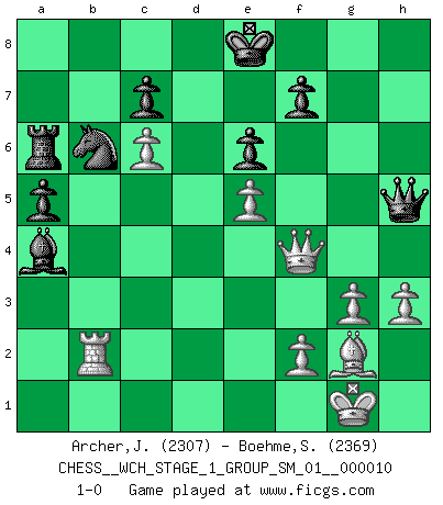 Last move : 1-0 2012 September 17 5:47:41 [Event "FICGS__CHESS__WCH_STAGE_1_GROUP_SM_01__000010"] [Site "FICGS"] [Date "2012.01.01"] [Round "1"] [White "Archer,J. Robert"] [Black "Boehme,Sebastian"] [Result "1-0"] [WhiteElo "2307"] [BlackElo "2369"] 1.d4 d5 2.c4 e6 3.Nf3 Nf6 4.g3 Be7 5.Bg2 O-O 6.O-O dxc4 7.Qc2 a6 8.Qxc4 b5 9.Qc2 Bb7 10.Bd2 Bd6 11.a4 Nbd7 12.Ba5 Ra7 13.Rc1 Qa8 14.Qd1 Rc8 15.b4 Nd5 16.Qb3 N5f6 17.Qb2 bxa4 18.Rxa4 Bd5 19.Nc3 Bc6 20.R4a1 Rb8 21.Na4 Bxb4 22.Bxb4 Nd5 23.Ng5 Rxb4 24.Qc2 h6 25.Qh7+ Kf8 26.Qh8+ Ke7 27.Qxg7 hxg5 28.Nc5 Nxc5 29.Qxg5+ Kd7 30.Rxc5 Rb5 31.e4 Rxc5 32.dxc5 Qh8 33.Rd1 Ba4 34.c6+ Ke8 35.Rb1 Nb6 36.e5 a5 37.Qf4 Ra6 38.Rb2 Qh5 39.h3 1-0 Queen's gambit declined Kingside Castling by player Black (move 5) Kingside Castling by player White (move 6) Player White won this chess game. Follow this game move after move (download)Chess is a forcing house where the fruits of character can ripen more fully than in life. (Edward Morgan Foster) Über Kasparov: Es ist offensichtlich, daß er in einem totalitären Staat aufwuchs und deshalb zu diktatorischen Zügen neigt. (Viktor Kortschnoi) La enorme capacidad mental, en la que sin ella no puede un jugador de Ajedrez existir, es demasiado requerida por el Ajedrez al grado de que nunca podrá liberar su mente de este juego. (Albert Einstein) La vie et les Echecs sont tous les deux une lutte constante. (Lasker) The message for business people contemplating their place in the cyberspace is simple and direct: get linked or get lost. (Vic Sussman and Kenan Pollack)