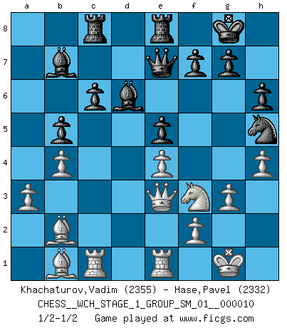 Last move : 1/2-1/2 2012 February 25 7:58:49 [Event "FICGS__CHESS__WCH_STAGE_1_GROUP_SM_01__000010"] [Site "FICGS"] [Date "2012.01.01"] [Round "1"] [White "Khachaturov,Vadim"] [Black "Hase,Pavel"] [Result "1/2-1/2"] [WhiteElo "2355"] [BlackElo "2332"] 1.e4 e5 2.Nf3 Nc6 3.Bb5 a6 4.Ba4 Nf6 5.O-O Be7 6.Re1 b5 7.Bb3 O-O 8.c3 d6 9.h3 Bb7 10.d4 Re8 11.Nbd2 Bf8 12.a3 h6 13.Bc2 Nb8 14.b4 Nbd7 15.Bb2 a5 16.Bd3 axb4 17.cxb4 c6 18.Rc1 Rc8 19.Qb3 exd4 20.Nxd4 Ne5 21.Bb1 Nh5 22.N4f3 Nf4 23.Nxe5 dxe5 24.Nf3 Qf6 25.h4 Bd6 26.Qe3 Nh5 27.g3 Qe7 1/2-1/2 Ruy Lopez : Closed, 7...O-O Kingside Castling by player White (move 5) Kingside Castling by player Black (move 7) This chess game ended in a draw. Follow this game move after move (download)Pawns: they are the soul of this game, they alone form the attack and defense. (Philidor) Ich suche im Schach immer etwas Eigenes. Riskantes Spiel im Stile schachlicher Musketiere ist nicht meine Sache, auch wenn es vielen Freunden scharfer Wendungen gefällt. (Anatoly Karpov) Antes de los Finales, los dioses han colocado el Juego Medio. (Siegbert Tarrasch) Les Echecs représentent une sphère d'idées créatrices basée sur la volonté des deux protagonistes. (Smyslov) Big Chess is a place for big hallucinations. (Thibault de Vassal)
