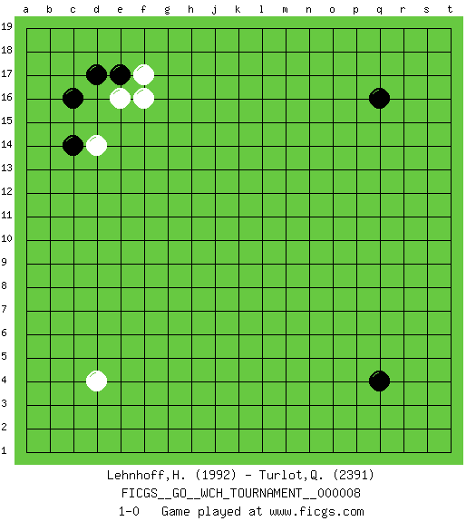 Last move : 1-0 2012 April 26 12:13:11 [Event "FICGS__GO__WCH_TOURNAMENT__000008"] [Site "FICGS"] [Date "2012.01.02"] [Round "1"] [Black "Lehnhoff,Heinz-Georg"] [White "Turlot,Quentin"] [Result "1-0"] [Rating 1 "1992"] [Rating 2 "2391"] 1.q16 d4 2.q4 e16 3.c16 d14 4.e17 f17 5.d17 f16 6.c14 1-0 Here are the names of the openings (joseki) played in the four corners : Corner d16 : e16 c16 Takamoku (Gomok, Gaomu`) 5-4 Point. The takamoku (high) point (5-4). With its emphasis on influence, the 5-4 point complements the 4-4 (hoshi) point in creating an influence-oriented fuseki. Komoku. White responds with 3-3, 3-5, 4-6, 4-7, 3-6, 3-7. Player Black won this Go (weiqi, baduk) game. Follow this game move after move (download)If there is no stone on the handicap point, the carpenter's square is dead. (Anonymous) Never was anything great achieved without danger. (Niccolo Machiavelli)