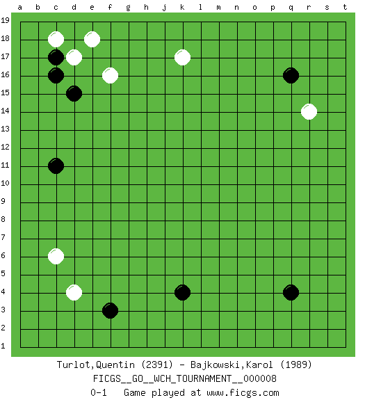 Last move : 0-1 2012 April 24 0:7:18 [Event "FICGS__GO__WCH_TOURNAMENT__000008 "] [Site "FICGS"] [Date "2012.01.02"] [Round "1"] [Black "Turlot,Quentin "] [White "Bajkowski,Karol "] [Result "0-1"] [Rating 1 "2391"] [Rating 2 "1989"] 1.q16 d4 2.q4 d17 3.d15 f16 4.c17 c18 5.c16 e18 6.c11 k17 7.f3 c6 8.k4 r14 0-1 Here are the names of the openings (joseki) played in the four corners : Corner d16 : d17 d15Komoku (Somok, Xiao~mu`) 3-4 Point. The komoku (3-4) point is the traditional corner enclosure move..Ikken Takagakari (Hankan Nop'dakeolch'im, Yi Gaogua`jiao~, 1-Space High Approach). The 5-4 approach move has become more popular in modern times, as modern Go emphasizes speed and influence. Corner d4 : d4 f3Hoshi (Hwajeom, Seongjeom, Xingwei`) 4-4 Point. The star or hoshi (4-4) point, emphasizing influence at the potential expense of territory.Ikken Kakari (Hankan Keolch'im, Yi Gua`jiao~, 1-Space Low Approach). Black 2 is the standard approach move to the 4-4. Corner q16 : q16 r14Hoshi (Hwajeom, Seongjeom, Xingwei`) 4-4 Point. The star or hoshi (4-4) point, emphasizing influence at the potential expense of territory.Ikken Kakari (Hankan Keolch'im, Yi Gua`jiao~, 1-Space Low Approach). White 2 is the standard approach move to the 4-4. Player White won this Go (weiqi, baduk) game.Follow this game move after move (download ) Do not make moves that strengthen your opponent ! (Anonymous) Convictions are more dangerous enemies of truth than lies. (Friedrich Nietzsche)