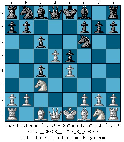 Last move : 0-1 2007 March 2 6:14:12 [Event "FICGS__CHESS__CLASS_B__000013"] [Site "FICGS"] [Date "2007.01.13"] [Round "1"] [White "Fuertes,Cesar"] [Black "Satonnet,Patrick"] [Result "0-1"] [WhiteElo "1939"] [BlackElo "1933"] 1.d4 d5 2.c4 dxc4 3.Nc3 e5 4.d5 c6 5.e4 Nf6 0-1 This chess game has been lost on time (started : 2007.01.13 9:33:15) Queen's gambit accepted Player Black won this chess game. Follow this game move after move (download)In life, as in Chess, one's own Pawns block one's way. A man's very wealth, ease, leisure, children, books, which should help him to win, more often checkmate him. (Charles Buxton) Im Internet Chess Club betrug mein Rating vorübergehend 3350 ELO-Punkte. (Sergej Karjakin) El pensamiento metódico es mas útil en el Ajedrez que la inspiración. (C. J. S. Purdy) La vie est comme un jeu d'échecs : nous esquissons un plan, mais celui-ci est tributaire de ce que daignent faire l'adversaire aux échecs et le destin dans la vie. (Arthur Schopenhauer) All battles are fought by scared men who'd rather be someplace else. (John Wayne in the movie In harm's way)