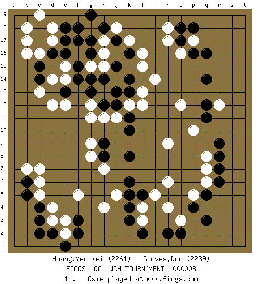 Last move : 1-0 2012 April 3 13:59:28 [Event "FICGS__GO__WCH_TOURNAMENT__000008"] [Site "FICGS"] [Date "2012.01.02"] [Round "1"] [Black "Huang,Yen-Wei"] [White "Groves,Don"] [Result "1-0"] [Rating 1 "2261"] [Rating 2 "2239"] 1.q16 d17 2.q3 d4 3.r9 o16 4.q14 l16 5.o17 p17 6.p16 n17 7.o18 n18 8.p18 h16 9.f3 f5 10.c3 d3 11.c4 c5 12.b5 c6 13.b6 c7 14.d2 e2 15.c2 e3 16.k4 n4 17.q5 n6 18.k6 n9 19.k8 d12 20.k10 l3 21.k3 l4 22.l5 m5 23.c17 c16 24.d16 b17 25.c18 b18 26.c15 b16 27.e17 d18 28.e18 c19 29.e16 d14 30.g16 h17 31.g14 h15 32.e13 e14 33.f14 e12 34.h14 g12 35.h12 h11 36.j12 j11 37.k11 j14 38.j13 r12 39.n2 q7 40.r7 q8 41.r8 p10 42.q11 o12 43.q12 k12 44.k14 l13 45.j15 m14 46.g17 g11 47.l2 g18 48.f18 j18 49.g13 g15 50.f15 f16 51.f17 e15 52.k13 l12 53.k16 l15 54.g19 k17 55.h18 o3 56.o2 b7 57.f2 q6 58.r6 p5 59.p4 h4 60.e1 j5 61.k5 h7 62.h9 g9 63.h8 g8 64.c14 c13 65.j17 1-0 Here are the names of the openings (joseki) played in the four corners : Corner q16 : q16 o16 Hoshi (Hwajeom, Seongjeom, Xingwei`) 4-4 Point. The star or hoshi (4-4) point, emphasizing influence at the potential expense of territory. Ikken Takagakari (Hankan Nop'dakeolch'im, Yi Gaojia, 1-Space High Approach). Black typically responds at 6-4 or 3-10. Black 4-10 is played when Black finds play on the right side advantageous. Black 4-8 or 3-8 may be played when Black has support at top. Corner d4 : d4 f3 Hoshi (Hwajeom, Seongjeom, Xingwei`) 4-4 Point. The star or hoshi (4-4) point, emphasizing influence at the potential expense of territory. Ikken Kakari (Hankan Keolch'im, Yi Gua`jiao~, 1-Space Low Approach). Black 2 is the standard approach move to the 4-4. Player Black won this Go (weiqi, baduk) game. Follow this game move after move (download)Capture what you cut off. (Anonymous) No, no, you're not thinking; you're just being logical. (Niels Bohr)