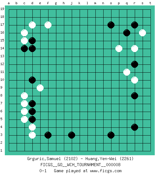 Last move : 0-1 2012 March 29 22:51:13 [Event "FICGS__GO__WCH_TOURNAMENT__000008"] [Site "FICGS"] [Date "2012.01.02"] [Round "1"] [Black "Grguric,Samuel"] [White "Huang,Yen-Wei"] [Result "0-1"] [Rating 1 "2102"] [Rating 2 "2261"] 1.q16 d17 2.r4 d4 3.o3 r10 4.r8 r14 5.r12 p14 6.o17 s16 7.r17 q11 8.d15 c15 9.c14 c16 10.d14 f17 11.d10 c8 12.f3 d3 13.d6 c6 14.d7 c7 15.d5 c5 16.j3 e9 0-1 This go game has been lost on time (started : 2012.01.02 0:6:46) Here are the names of the openings (joseki) played in the four corners : Corner q16 : q16 r14 Hoshi (Hwajeom, Seongjeom, Xingwei`) 4-4 Point. The star or hoshi (4-4) point, emphasizing influence at the potential expense of territory. Ikken Kakari (Hankan Keolch'im, Yi Gua`jiao~, 1-Space Low Approach). White 2 is the standard approach move to the 4-4. Corner d16 : d17 d15 Komoku (Somok, Xiao~mu`) 3-4 Point. The komoku (3-4) point is the traditional corner enclosure move.. Ikken Takagakari (Hankan Nop'dakeolch'im, Yi Gaogua`jiao~, 1-Space High Approach). The 5-4 approach move has become more popular in modern times, as modern Go emphasizes speed and influence. Player White won this Go (weiqi, baduk) game. Follow this game move after move (download)Conservative and slow will win. Believe it ! (Anonymous) Life doesn't imitate art, it imitates bad television. (Woody Allen)