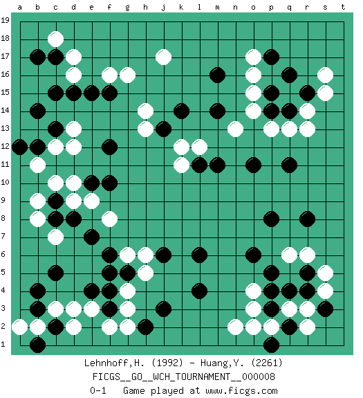Last move : 0-1 2012 August 19 13:26:30 [Event "FICGS__GO__WCH_TOURNAMENT__000008 "] [Site "FICGS"] [Date "2012.01.02"] [Round "1"] [Black "Lehnhoff,Heinz-Georg "] [White "Huang,Yen-Wei "] [Result "0-1"] [Rating 1 "1992"] [Rating 2 "2261"] 1.q16 d17 2.q4 d3 3.c15 d12 4.e15 f16 5.c17 c18 6.b17 d16 7.d15 j17 8.c13 c12 9.b12 b11 10.f15 g16 11.c5 c7 12.e4 e3 13.f4 g3 14.f3 f2 15.e7 g4 16.c8 b8 17.d8 b9 18.a12 d13 19.b14 d10 20.f10 o3 21.p3 o4 22.l4 r6 23.r5 q6 24.l6 r3 25.j3 p2 26.h2 g2 27.b3 b2 28.q11 o17 29.p17 o16 30.c9 c10 31.r8 r13 32.p8 s16 33.q14 r14 34.r15 s15 35.o6 s5 36.p5 q13 37.p14 p13 38.q2 q3 39.r4 s4 40.p4 n2 41.m16 o14 42.p15 o15 43.m14 g6 44.j6 f8 45.p1 o2 46.g5 h5 47.f5 h6 48.f6 e9 49.o11 n13 50.m11 l12 51.k14 h14 52.s3 r2 53.l11 k12 54.j13 k11 55.f12 h13 56.e10 d9 57.c2 c3 58.b1 a2 59.b4 d2 0-1 Here are the names of the openings (joseki) played in the four corners : Corner d16 : d17 c15Komoku (Somok, Xiao~mu`) 3-4 Point. The komoku (3-4) point is the traditional corner enclosure move..Ikken Kakari (Hankan Keolch'im, Yi Gua`jiao~, 1-Space Low Pincer). The small knight move is the basic approach move to the 3-4 point stone. It has been continually used for over four centuries. There are limitless variations, with new moves constantly being discovered. Black 2 opens the door to a treaure store of joseki. Corner d4 : d3 c5Komoku (Somok, Xiao~mu`) 3-4 Point. The komoku (3-4) point is the traditional corner enclosure move..Ikken Kakari (Hankan Keolch'im, Yi Gua`jiao~, 1-Space Low Pincer). The small knight move is the basic approach move to the 3-4 point stone. It has been continually used for over four centuries. There are limitless variations, with new moves constantly being discovered. Black 2 opens the door to a treaure store of joseki. Corner q4 : q4 o3Hoshi (Hwajeom, Seongjeom, Xingwei`) 4-4 Point. The star or hoshi (4-4) point, emphasizing influence at the potential expense of territory.Ikken Kakari (Hankan Keolch'im, Yi Gua`jiao~, 1-Space Low Approach). White 2 is the standard approach move to the 4-4. Player White won this Go (weiqi, baduk) game.Follow this game move after move (download ) When your opponent has two weak groups, attack them both at once. (Anonymous) Life is pain my dear and anyone who says otherwise is selling something. (Princess Bride)