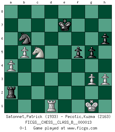 Last move : 0-1 2007 August 27 23:56:53 [Event "FICGS__CHESS__CLASS_B__000013"] [Site "FICGS"] [Date "2007.01.13"] [Round "1"] [White "Satonnet,Patrick"] [Black "Pecotic,Kuzma"] [Result "0-1"] [WhiteElo "1933"] [BlackElo "2163"] 1.Nf3 Nf6 2.g3 b6 3.Bg2 Bb7 4.O-O d5 5.d4 e6 6.c4 dxc4 7.Qa4+ Nbd7 8.Qxc4 c5 9.dxc5 Bxc5 10.Nc3 a6 11.Bg5 h6 12.Bxf6 Nxf6 13.Qa4+ b5 14.Nxb5 O-O 15.Nbd4 Qb6 16.Nb3 Rac8 17.Rac1 Rfd8 18.Ne5 Bxg2 19.Kxg2 Qb7+ 20.Nc6 Qxc6+ 21.Qxc6 Rxc6 22.Rxc5 Rxc5 23.Nxc5 Rd2 24.Rb1 Rxe2 25.Kf3 Rc2 26.Nxa6 e5 27.h3 Nd5 28.Ke4 Nb6 29.Kxe5 Rxf2 30.Nc5 Rd2 31.Kf4 g5+ 32.Kf3 Nc4 33.a4 Rd5 34.Ne4 Rd3+ 35.Kg2 f5 36.Nc5 Rd2+ 37.Kg1 Kf7 38.b4 Ra2 39.b5 Nb6 40.Rd1 Ke7 0-1 Reti Opening Kingside Castling by player White (move 4) Kingside Castling by player Black (move 14) Player Black won this chess game. Follow this game move after move (download)Chess teaches you to control the initial excitement you feel when you see something that looks good and it trains you to think objectively when you're in trouble. (Stanley Kubrick) Um sich vor der Gefahr einer Erkältung zu schützen, sorge der wanderlustige König beizeiten für ein brauchbares Versteck. (Aaron Nimzowitsch) Peones: ellos son el alma de esta partida, solos forman el ataque y la defensa. (Philidor) Aucun coup ne doit être joué sans but. (Pedro Damiano) Somewhere in the world there is an epigram for every dilemma. (Hendrik Willem van Loon)