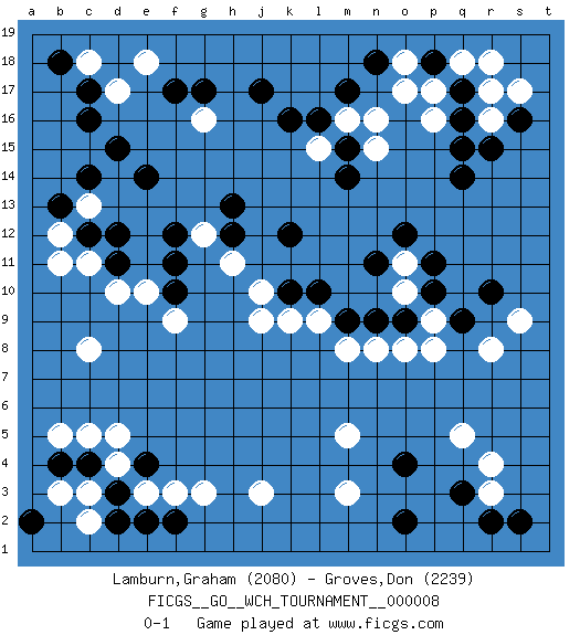 Last move : 0-1 2012 January 26 14:47:39 [Event "FICGS__GO__WCH_TOURNAMENT__000008"] [Site "FICGS"] [Date "2012.01.02"] [Round "1"] [Black "Lamburn,Graham"] [White "Groves,Don"] [Result "0-1"] [Rating 1 "2080"] [Rating 2 "2239"] 1.q16 d4 2.q3 d17 3.d15 c13 4.c17 c18 5.c16 e18 6.e14 g16 7.d12 c11 8.c12 b12 9.b13 b11 10.c14 c8 11.j17 o17 12.m17 n16 13.q14 q18 14.f17 q5 15.o4 r3 16.r2 r4 17.s2 r8 18.g17 r17 19.r10 p9 20.p10 o10 21.p11 o11 22.o9 o8 23.n9 n8 24.m9 m8 25.q9 p8 26.o12 l9 27.n11 m3 28.o2 j3 29.d3 c3 30.e4 e3 31.d2 c2 32.e2 f3 33.f2 g3 34.c4 d5 35.b4 b3 36.a2 c5 37.b18 b5 38.s16 s17 39.d11 m16 40.l16 l15 41.k16 r16 42.r15 s9 43.l10 k9 44.k10 j9 45.p18 p17 46.q17 p16 47.q15 r18 48.m15 n15 49.m14 j10 50.k12 h11 51.h12 g12 52.n18 o18 53.h13 d10 54.f11 e10 55.f10 f9 56.f12 m5 0-1 Here are the names of the openings (joseki) played in the four corners : Corner d16 : d17 d15 Komoku (Somok, Xiao~mu`) 3-4 Point. The komoku (3-4) point is the traditional corner enclosure move.. Ikken Takagakari (Hankan Nop'dakeolch'im, Yi Gaogua`jiao~, 1-Space High Approach). The 5-4 approach move has become more popular in modern times, as modern Go emphasizes speed and influence. Corner q16 : q16 o17 Hoshi (Hwajeom, Seongjeom, Xingwei`) 4-4 Point. The star or hoshi (4-4) point, emphasizing influence at the potential expense of territory. Ikken Kakari (Hankan Keolch'im, Yi Gua`jiao~, 1-Space Low Approach). White 2 is the standard approach move to the 4-4. Corner q4 : q3 q5 Komoku (Somok, Xiao~mu`) 3-4 Point. The komoku (3-4) point is the traditional corner enclosure move.. Ikken Takagakari (Hankan Nop'dakeolch'im, Yi Gaogua`jiao~, 1-Space High Approach). The 5-4 approach move has become more popular in modern times, as modern Go emphasizes speed and influence. Player White won this Go (weiqi, baduk) game. Follow this game move after move (download)The game plays itself, the players don't control it. (Pierre Audouard) You think that education is too expensive ? Try ignorance. (Derek Bok)