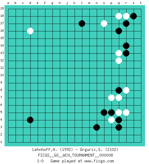 Last move : 1-0 2012 March 24 21:34:30 [Event "FICGS__GO__WCH_TOURNAMENT__000008"] [Site "FICGS"] [Date "2012.01.02"] [Round "1"] [Black "Lehnhoff,Heinz-Georg"] [White "Grguric,Samuel"] [Result "1-0"] [Rating 1 "1992"] [Rating 2 "2102"] 1.q16 d16 2.q3 r5 3.q8 p4 4.q4 q5 5.p5 q7 6.o5 p7 7.n3 r8 8.d4 o17 9.r14 q18 10.r17 q13 11.r13 q12 12.l17 r18 13.s18 1-0 This go game has been lost on time (started : 2012.01.02 0:6:46) Here are the names of the openings (joseki) played in the four corners : Corner q4 : q3 r5 Komoku (Somok, Xiao~mu`) 3-4 Point. The komoku (3-4) point is the traditional corner enclosure move.. Ikken Kakari (Hankan Keolch'im, Yi Gua`jiao~, 1-Space Low Pincer). The small knight move is the basic approach move to the 3-4 point stone. It has been continually used for over four centuries. There are limitless variations, with new moves constantly being discovered. White 2 opens the door to a treaure store of joseki. Corner q16 : q16 o17 Hoshi (Hwajeom, Seongjeom, Xingwei`) 4-4 Point. The star or hoshi (4-4) point, emphasizing influence at the potential expense of territory. Ikken Kakari (Hankan Keolch'im, Yi Gua`jiao~, 1-Space Low Approach). White 2 is the standard approach move to the 4-4. Player Black won this Go (weiqi, baduk) game. Follow this game move after move (download)Learn to play under the stones. (Anonymous) Excelling at chess has long been considered a symbol of more general intelligence. That is an incorrect assumption in my view, as pleasant as it might be. But for the purposes of argument and investigation, chess is, in Russkin-Gutman's words, 'an unparalleled laboratory, since both the learning process and the degree of ability obtained can be objectified and quantified, providing an excellent comparative framework on which to use rigorous analytical techniques.' (The Chess Master and the Computer, by Garry Kasparov - 2010)