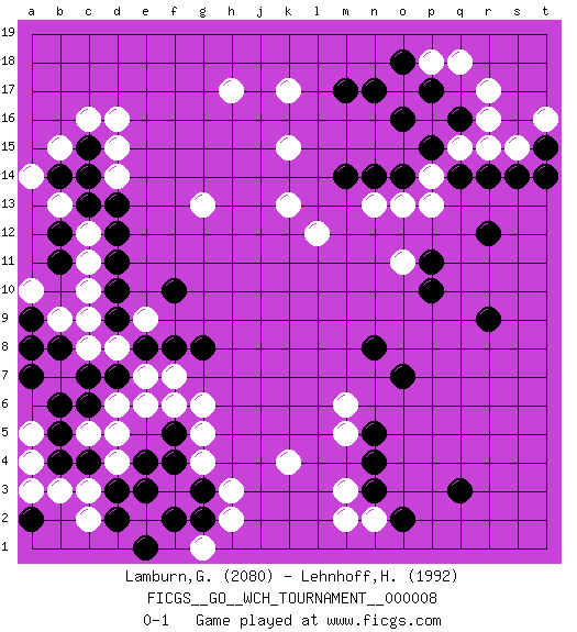 Last move : 0-1 2012 September 27 8:46:40 [Event "FICGS__GO__WCH_TOURNAMENT__000008"] [Site "FICGS"] [Date "2012.01.02"] [Round "1"] [Black "Lamburn,Graham"] [White "Lehnhoff,Heinz-Georg"] [Result "0-1"] [Rating 1 "2080"] [Rating 2 "1992"] 1.q16 d4 2.q3 d16 3.r9 k4 4.n4 o17 5.q14 q18 6.m17 r17 7.p17 p18 8.o16 s15 9.s14 r15 10.r14 q15 11.p15 p14 12.o14 p13 13.r12 o13 14.n14 n13 15.m14 m3 16.n3 n2 17.o2 m2 18.c6 c8 19.f4 h17 20.d3 c3 21.e3 c2 22.c4 c5 23.b4 d6 24.b5 d5 25.b6 g5 26.d7 d8 27.e8 e7 28.c7 f6 29.d9 e9 30.f8 c9 31.d10 c10 32.d11 c11 33.d12 c12 34.f10 d14 35.p11 g4 36.g3 h3 37.g2 b3 38.d2 a4 39.b8 b9 40.a7 a5 41.a2 o11 42.p10 a8 43.a9 l12 44.o18 k13 45.c13 b13 46.c14 b15 47.b14 a14 48.c15 c16 49.b12 d15 50.d13 a10 51.a8 a3 52.b11 h2 53.f5 f7 54.g8 g6 55.e4 k17 56.t15 r16 57.n17 t16 58.t14 g1 59.f2 e6 60.e1 m5 61.n5 m6 62.o7 k15 63.n8 g13 0-1 This go game has been lost on time (started : 2012.01.02 0:6:46) Here are the names of the openings (joseki) played in the four corners : Corner q16 : q16 o17 Hoshi (Hwajeom, Seongjeom, Xingwei`) 4-4 Point. The star or hoshi (4-4) point, emphasizing influence at the potential expense of territory. Ikken Kakari (Hankan Keolch'im, Yi Gua`jiao~, 1-Space Low Approach). White 2 is the standard approach move to the 4-4. Corner d4 : d4 c6 Hoshi (Hwajeom, Seongjeom, Xingwei`) 4-4 Point. The star or hoshi (4-4) point, emphasizing influence at the potential expense of territory. Ikken Kakari (Hankan Keolch'im, Yi Gua`jiao~, 1-Space Low Approach). Black 2 is the standard approach move to the 4-4. Player White won this Go (weiqi, baduk) game. Follow this game move after move (download)On the third line, four die, six live. (Anonymous) Political correctness is subjecting us to gross incompetence. (Johann Piek)