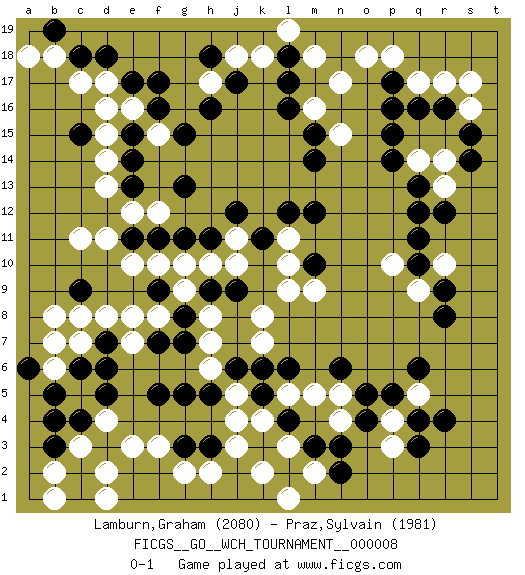 Last move : 0-1 2012 September 24 20:6:8 [Event "FICGS__GO__WCH_TOURNAMENT__000008"] [Site "FICGS"] [Date "2012.01.02"] [Round "1"] [Black "Lamburn,Graham"] [White "Praz,Sylvain"] [Result "0-1"] [Rating 1 "2080"] [Rating 2 "1981"] 1.q16 d4 2.q3 d17 3.r9 f3 4.c15 c11 5.f17 e16 6.f16 f15 7.e15 d15 8.e14 d14 9.e13 d13 10.g15 e12 11.g13 f12 12.l4 n17 13.l17 r14 14.p15 r17 15.r16 q17 16.p17 p18 17.p16 o18 18.q13 q5 19.r4 p3 20.q4 p4 21.p5 n4 22.o5 n5 23.q6 j4 24.b5 c5 25.b4 b6 26.c6 c7 27.d6 b8 28.a6 b7 29.d3 c3 30.c4 d2 31.b3 e3 32.d5 e7 33.f5 h6 34.d7 d8 35.c2 b2 36.c1 b1 37.d3 r13 38.q12 c3 39.f7 e8 40.d3 q14 41.p14 c3 42.g5 d1 43.h5 j5 44.j6 h7 45.g7 h8 46.c9 c8 47.f9 f8 48.g8 g9 49.h9 g10 50.j9 k7 51.k6 k8 52.h3 j3 53.g3 l3 54.m3 l5 55.k3 k2 56.l2 h2 57.k5 k4 58.l6 g2 59.n6 m5 60.n3 l3 61.o4 r10 62.r12 s16 63.h11 l9 64.g11 f10 65.f11 e10 66.e11 d11 67.m10 l10 68.m12 l11 69.l12 j11 70.j12 h10 71.k11 j10 72.s15 s17 73.s14 q9 74.r8 m9 75.q10 p10 76.q11 m16 77.c18 c17 78.d18 b18 79.e17 d16 80.b19 a18 81.l16 m18 82.m15 k18 83.l18 l19 84.j17 j18 85.h18 n15 86.m14 m2 87.n2 h17 88.h16 l1 0-1 Here are the names of the openings (joseki) played in the four corners : Corner d16 : d17 c15 Komoku (Somok, Xiao~mu`) 3-4 Point. The komoku (3-4) point is the traditional corner enclosure move.. Ikken Kakari (Hankan Keolch'im, Yi Gua`jiao~, 1-Space Low Pincer). The small knight move is the basic approach move to the 3-4 point stone. It has been continually used for over four centuries. There are limitless variations, with new moves constantly being discovered. Black 2 opens the door to a treaure store of joseki. Corner q16 : q16 n17 Hoshi (Hwajeom, Seongjeom, Xingwei`) 4-4 Point. The star or hoshi (4-4) point, emphasizing influence at the potential expense of territory. Niken Kakari (Dukan Keolch'im, E`r Gua`jiao~, 2-Space Low Approach). Black typically answers by 7-3 or 3-5 (which is not joseki). Player White won this Go (weiqi, baduk) game. Follow this game move after move (download)You can hide nothing on the goban. (Pierre Audouard) I believe in luck. How else can you explain the success of those you dislike ? (Jean Cocteau)