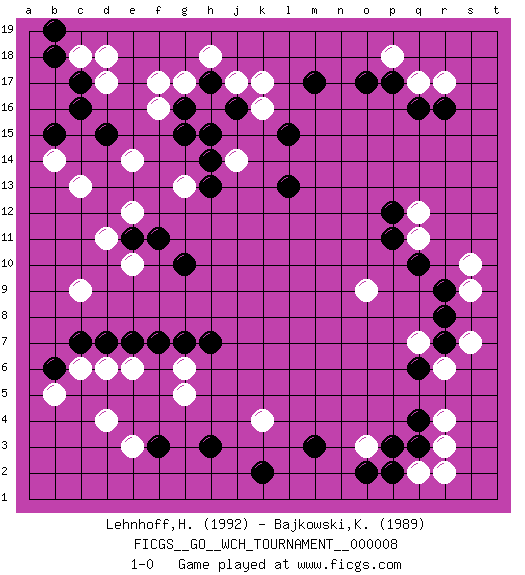 Last move : 1-0 2012 May 2 20:7:24 [Event "FICGS__GO__WCH_TOURNAMENT__000008"] [Site "FICGS"] [Date "2012.01.02"] [Round "1"] [Black "Lehnhoff,Heinz-Georg"] [White "Bajkowski,Karol"] [Result "1-0"] [Rating 1 "1992"] [Rating 2 "1989"] 1.q16 d4 2.q4 d17 3.d15 f16 4.c17 c18 5.c16 k17 6.f3 c13 7.b18 d18 8.b19 c9 9.d7 c6 10.c7 d6 11.f7 e6 12.e7 g5 13.h3 e3 14.g16 g17 15.h17 h16 16.g15 f17 17.j16 j17 18.h15 h18 19.q10 k4 20.k2 e14 21.h7 b14 22.b15 g6 23.g7 o3 24.m3 r3 25.q3 q2 26.p2 r2 27.p3 r4 28.o2 r6 29.l15 e10 30.g10 g13 31.f11 e12 32.e11 d11 33.m17 r17 34.r16 q17 35.p17 p18 36.o17 j14 37.h13 k16 38.l13 s10 39.r9 q11 40.p11 q12 41.p12 s9 42.r8 s7 43.h14 o9 44.b6 b5 45.q6 q7 46.r7 1-0 Here are the names of the openings (joseki) played in the four corners : Corner d16 : d17 d15 Komoku (Somok, Xiao~mu`) 3-4 Point. The komoku (3-4) point is the traditional corner enclosure move.. Ikken Takagakari (Hankan Nop'dakeolch'im, Yi Gaogua`jiao~, 1-Space High Approach). The 5-4 approach move has become more popular in modern times, as modern Go emphasizes speed and influence. Corner d4 : d4 f3 Hoshi (Hwajeom, Seongjeom, Xingwei`) 4-4 Point. The star or hoshi (4-4) point, emphasizing influence at the potential expense of territory. Ikken Kakari (Hankan Keolch'im, Yi Gua`jiao~, 1-Space Low Approach). Black 2 is the standard approach move to the 4-4. Corner q4 : q4 o3 Hoshi (Hwajeom, Seongjeom, Xingwei`) 4-4 Point. The star or hoshi (4-4) point, emphasizing influence at the potential expense of territory. Ikken Kakari (Hankan Keolch'im, Yi Gua`jiao~, 1-Space Low Approach). White 2 is the standard approach move to the 4-4. Player Black won this Go (weiqi, baduk) game. Follow this game move after move (download)Learn the eye-stealing tesuji. (Anonymous) You know what they say : You lie down with the Devil, you wake up in Hell. (Horatio Caine, C.S.I. Miami)