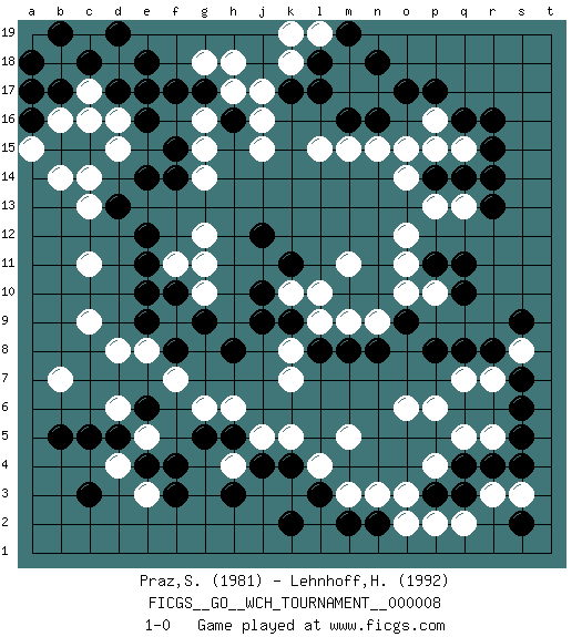 Last move : 1-0 2012 August 6 0:12:34 [Event "FICGS__GO__WCH_TOURNAMENT__000008"] [Site "FICGS"] [Date "2012.01.02"] [Round "1"] [Black "Praz,Sylvain"] [White "Lehnhoff,Heinz-Georg"] [Result "1-0"] [Rating 1 "1981"] [Rating 2 "1992"] 1.r16 d4 2.q3 d16 3.f17 c14 4.l17 j17 5.o17 j15 6.d17 c17 7.e16 d18 8.e18 e17 9.h16 j16 10.d17 c11 11.e17 c16 12.c18 g14 13.f3 e3 14.f4 d6 15.k4 h4 16.h3 j5 17.j4 b18 18.d19 g18 19.b19 k5 20.b17 l4 21.l3 m3 22.k2 m5 23.m2 r5 24.q8 s3 25.q11 r7 26.r8 q7 27.p8 b16 28.a18 n3 29.n2 s8 30.s9 p13 31.r13 l15 32.e14 g12 33.e12 g10 34.e10 c9 35.c3 n15 36.m16 p15 37.q16 o11 38.m8 n9 39.n8 m9 40.l8 l9 41.o9 o3 42.k9 k10 43.j10 k8 44.j9 m11 45.k11 l10 46.g9 e8 47.h8 k7 48.b5 f9 49.f10 g11 50.f8 g16 51.e9 o6 52.c5 d8 53.d5 f7 54.d13 c13 55.f15 m15 56.j12 e5 57.e4 o2 58.s7 b7 59.s6 q2 60.s5 q5 61.s4 r3 62.r4 g15 63.q4 p4 64.p3 p2 65.a16 a15 66.a17 b14 67.q14 q15 68.r15 k18 69.l18 l19 70.m19 k19 71.n18 p16 72.p17 p10 73.q10 p6 74.p14 o14 75.n16 q13 76.r14 o15 77.g17 d15 78.f14 h17 79.k17 h18 80.p11 o12 81.h5 h6 82.g5 g6 83.e6 f11 84.e11 o10 85.s2 1-0 Here are the names of the openings (joseki) played in the four corners : Corner d16 : d16 f17 Hoshi (Hwajeom, Seongjeom, Xingwei`) 4-4 Point. The star or hoshi (4-4) point, emphasizing influence at the potential expense of territory. Ikken Kakari (Hankan Keolch'im, Yi Gua`jiao~, 1-Space Low Approach). Black 2 is the standard approach move to the 4-4. Corner d4 : d4 f3 Hoshi (Hwajeom, Seongjeom, Xingwei`) 4-4 Point. The star or hoshi (4-4) point, emphasizing influence at the potential expense of territory. Ikken Kakari (Hankan Keolch'im, Yi Gua`jiao~, 1-Space Low Approach). Black 2 is the standard approach move to the 4-4. Corner q4 : q3 l4 Komoku (Somok, Xiao~mu`) 3-4 Point. The komoku (3-4) point is the traditional corner enclosure move.. Player Black won this Go (weiqi, baduk) game. Follow this game move after move (download)Don't count territory held by only one eye. (Anonymous) It's not enough to succeed. Others must fail. (Gore Vidal)
