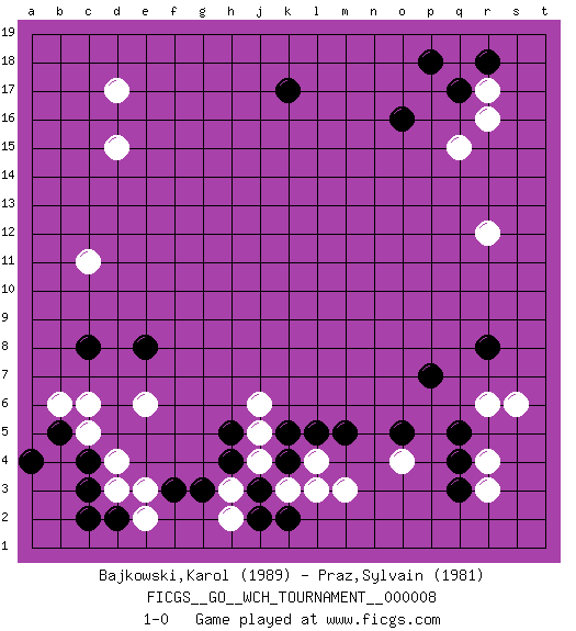 Last move : 1-0 2012 February 26 19:46:5 [Event "FICGS__GO__WCH_TOURNAMENT__000008 "] [Site "FICGS"] [Date "2012.01.02"] [Round "1"] [Black "Bajkowski,Karol "] [White "Praz,Sylvain "] [Result "1-0"] [Rating 1 "1989"] [Rating 2 "1981"] 1.q17 d4 2.q4 d17 3.f3 c6 4.k4 r6 5.r8 r3 6.q3 r4 7.q5 s6 8.p7 q15 9.o16 r17 10.r18 r16 11.p18 r12 12.k17 d15 13.c8 c11 14.c3 d3 15.d2 e6 16.e8 e2 17.c2 e3 18.b5 b6 19.c4 c5 20.a4 m3 21.m5 o4 22.o5 k3 23.j3 l4 24.l5 j4 25.k5 h3 26.j2 h2 27.k2 l3 28.h4 j5 29.h5 j6 30.g3 1-0 Here are the names of the openings (joseki) played in the four corners : Corner d4 : d4 f3Hoshi (Hwajeom, Seongjeom, Xingwei`) 4-4 Point. The star or hoshi (4-4) point, emphasizing influence at the potential expense of territory.Ikken Kakari (Hankan Keolch'im, Yi Gua`jiao~, 1-Space Low Approach). Black 2 is the standard approach move to the 4-4. Corner q4 : q4 r6Hoshi (Hwajeom, Seongjeom, Xingwei`) 4-4 Point. The star or hoshi (4-4) point, emphasizing influence at the potential expense of territory.Ikken Kakari (Hankan Keolch'im, Yi Gua`jiao~, 1-Space Low Approach). White 2 is the standard approach move to the 4-4. Corner q16 : q17 q15Komoku (Somok, Xiao~mu`) 3-4 Point. The komoku (3-4) point is the traditional corner enclosure move..Ikken Takagakari (Hankan Nop'dakeolch'im, Yi Gaogua`jiao~, 1-Space High Approach). The 5-4 approach move has become more popular in modern times, as modern Go emphasizes speed and influence. Player Black won this Go (weiqi, baduk) game.Follow this game move after move (download ) More haste less speed. (John Fairbairn) Real knowledge is to know the extent of one's ignorance. (Confucius)