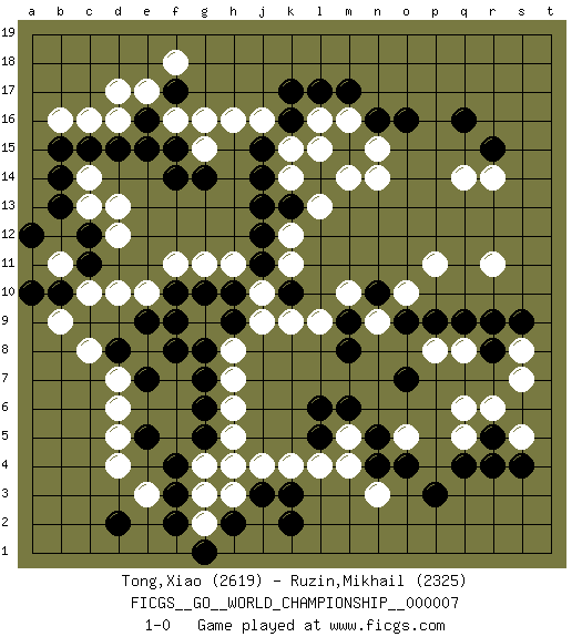 Last move : 1-0 2012 September 6 8:32:55 [Event "FICGS__GO__WORLD_CHAMPIONSHIP__000007"] [Site "FICGS"] [Date "2012.01.02"] [Round "1"] [Black "Tong,Xiao"] [White "Ruzin,Mikhail"] [Result "1-0"] [Rating 1 "2619"] [Rating 2 "2325"] 1.q16 d4 2.q4 d16 3.f17 c14 4.k16 r11 5.r9 r14 6.r15 q14 7.o16 p11 8.p9 n14 9.k3 d10 10.f3 e3 11.f4 d6 12.p3 r6 13.r5 q8 14.q9 s5 15.s4 q5 16.r4 q6 17.o7 o5 18.m6 m5 19.l6 k4 20.l5 l4 21.n5 m4 22.n4 n3 23.o4 h3 24.j3 j4 25.h2 g2 26.h4 g3 27.f2 g4 28.g5 h5 29.g1 h4 30.e5 d5 31.g6 h6 32.g7 h7 33.g8 h8 34.d8 e8 35.k2 g9 36.e7 d7 37.e9 c8 38.f8 m16 39.h9 j9 40.h10 j10 41.j11 h11 42.g10 g11 43.f10 k11 44.j12 k12 45.j13 n9 46.m9 m10 47.n10 l9 48.m8 o10 49.m15 n15 50.n16 l15 51.m17 l16 52.l17 k15 53.j15 j16 54.k17 h16 55.k10 k9 56.f15 g15 57.l14 k14 58.k13 m14 59.j14 l13 60.g14 f16 61.e16 g16 62.f14 e17 63.e15 f18 64.d15 c16 65.c15 b16 66.b15 d17 67.d2 f11 68.c12 e10 69.f9 d12 70.c11 d13 71.b14 c13 72.b13 c10 73.b10 b9 74.a12 b11 75.a10 s7 76.r8 s8 77.s9 p8 78.o9 1-0 Here are the names of the openings (joseki) played in the four corners : Corner d16 : d16 f17 Hoshi (Hwajeom, Seongjeom, Xingwei`) 4-4 Point. The star or hoshi (4-4) point, emphasizing influence at the potential expense of territory. Ikken Kakari (Hankan Keolch'im, Yi Gua`jiao~, 1-Space Low Approach). Black 2 is the standard approach move to the 4-4. Corner q16 : q16 r11 Hoshi (Hwajeom, Seongjeom, Xingwei`) 4-4 Point. The star or hoshi (4-4) point, emphasizing influence at the potential expense of territory. Corner d4 : d4 f3 Hoshi (Hwajeom, Seongjeom, Xingwei`) 4-4 Point. The star or hoshi (4-4) point, emphasizing influence at the potential expense of territory. Ikken Kakari (Hankan Keolch'im, Yi Gua`jiao~, 1-Space Low Approach). Black 2 is the standard approach move to the 4-4. Player Black won this Go (weiqi, baduk) game. Follow this game move after move (download)The poor player plays the opponent's game for him. (Anonymous) Being number two sucks. (Andre Agassi)