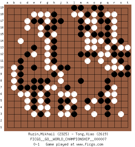 Last move : 0-1 2012 September 6 8:32:35 [Event "FICGS__GO__WORLD_CHAMPIONSHIP__000007"] [Site "FICGS"] [Date "2012.01.02"] [Round "2"] [Black "Ruzin,Mikhail"] [White "Tong,Xiao"] [Result "0-1"] [Rating 1 "2325"] [Rating 2 "2619"] 1.q16 d4 2.q3 d16 3.r9 n4 4.q5 k4 5.f17 c14 6.j17 o17 7.m17 r17 8.q17 r16 9.q15 q18 10.p18 r18 11.p17 r14 12.p13 f16 13.g16 f15 14.e17 d17 15.g15 g14 16.h14 g13 17.h13 g12 18.h12 g11 19.c8 c6 20.c11 b10 21.c10 b9 22.c9 b8 23.c7 b7 24.g8 h15 25.h11 h10 26.j10 j9 27.h9 g10 28.k10 j8 29.g5 f6 30.g6 g7 31.f7 h7 32.e6 f5 33.e5 f4 34.e4 e7 35.f8 e3 36.f3 g4 37.d7 d6 38.e8 d5 39.e7 g3 40.e10 g17 41.h16 g18 42.h17 e18 43.h18 f18 44.e13 e12 45.d12 o3 46.l4 l5 47.k5 l6 48.k7 k6 49.j5 j6 50.j4 k3 51.l3 j3 52.m8 r7 53.q7 q6 54.p6 r6 55.q8 r5 56.q4 s3 57.n5 o5 58.p5 q10 59.r13 s13 60.s14 r10 61.s9 r15 62.s12 q13 63.r12 q12 64.q14 p12 65.s11 o13 66.o12 p14 67.o15 n15 68.n16 o16 69.p15 o18 70.o19 n19 71.p19 n11 72.n12 n13 73.m12 n17 74.m16 o14 75.m19 m18 76.n18 s10 77.t10 n19 78.m15 n14 79.n18 t11 80.t9 n19 81.l19 l18 82.n18 t13 83.t12 n19 84.q11 p11 85.n18 r11 0-1 Here are the names of the openings (joseki) played in the four corners : Corner d16 : d16 f17 Hoshi (Hwajeom, Seongjeom, Xingwei`) 4-4 Point. The star or hoshi (4-4) point, emphasizing influence at the potential expense of territory. Ikken Kakari (Hankan Keolch'im, Yi Gua`jiao~, 1-Space Low Approach). Black 2 is the standard approach move to the 4-4. Corner q16 : q16 o17 Hoshi (Hwajeom, Seongjeom, Xingwei`) 4-4 Point. The star or hoshi (4-4) point, emphasizing influence at the potential expense of territory. Ikken Kakari (Hankan Keolch'im, Yi Gua`jiao~, 1-Space Low Approach). White 2 is the standard approach move to the 4-4. Corner d4 : d4 c8 Hoshi (Hwajeom, Seongjeom, Xingwei`) 4-4 Point. The star or hoshi (4-4) point, emphasizing influence at the potential expense of territory. Player White won this Go (weiqi, baduk) game. Follow this game move after move (download)Use a wall to attack, not to make territory. (Anonymous) Sometimes it pays to stay in bed in Monday, rather than spending the rest of the week debugging Monday's code. (Dan Salomon)