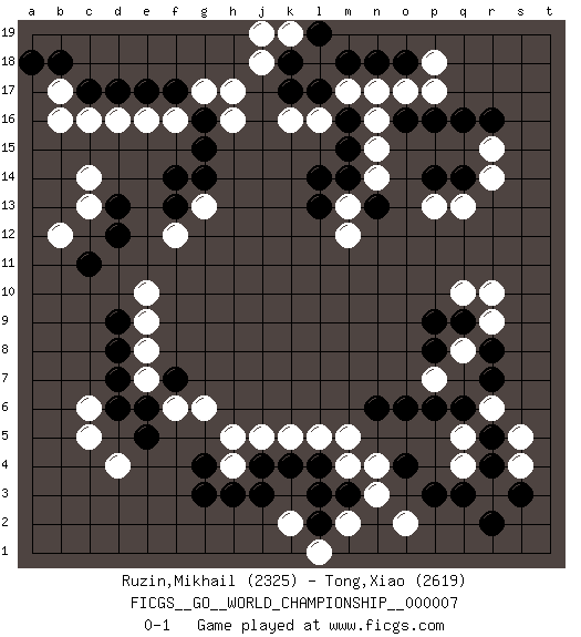 Last move : 0-1 2012 May 16 18:13:0 [Event "FICGS__GO__WORLD_CHAMPIONSHIP__000007"] [Site "FICGS"] [Date "2012.01.02"] [Round "4"] [Black "Ruzin,Mikhail"] [White "Tong,Xiao"] [Result "0-1"] [Rating 1 "2325"] [Rating 2 "2619"] 1.q16 d4 2.q3 d16 3.q9 n4 4.l4 q4 5.r4 r3 6.r5 q5 7.p3 r6 8.s3 p7 9.o4 m4 10.o6 l5 11.k4 k5 12.j4 j5 13.g4 h4 14.h3 h5 15.g3 f6 16.e5 c6 17.e6 e7 18.f7 g6 19.d7 e8 20.d6 c5 21.d8 e9 22.d9 e10 23.n6 k2 24.l3 m2 25.m3 n3 26.l2 l1 27.j3 m5 28.p6 r9 29.r8 q8 30.q6 s4 31.r2 s5 32.r7 r10 33.p8 q10 34.p9 r14 35.q14 q13 36.p14 r15 37.r16 p13 38.o16 o2 39.c11 c13 40.d12 f12 41.d13 c14 42.f13 g13 43.f14 g17 44.g14 m17 45.f17 f16 46.g16 h16 47.g15 h17 48.c17 c16 49.e17 e16 50.d17 b17 51.b18 b16 52.a18 b12 53.k17 k16 54.l17 l16 55.m18 n17 56.n18 o17 57.o18 p17 58.p16 p18 59.m16 n16 60.m15 n15 61.m14 n14 62.n13 m13 63.l13 m12 64.l14 j18 65.k18 k19 66.l19 j19 0-1 Here are the names of the openings (joseki) played in the four corners : Corner d4 : d4 j4 Hoshi (Hwajeom, Seongjeom, Xingwei`) 4-4 Point. The star or hoshi (4-4) point, emphasizing influence at the potential expense of territory. Corner q16 : q16 r14 Hoshi (Hwajeom, Seongjeom, Xingwei`) 4-4 Point. The star or hoshi (4-4) point, emphasizing influence at the potential expense of territory. Ikken Kakari (Hankan Keolch'im, Yi Gua`jiao~, 1-Space Low Approach). White 2 is the standard approach move to the 4-4. Corner d16 : d16 c11 Hoshi (Hwajeom, Seongjeom, Xingwei`) 4-4 Point. The star or hoshi (4-4) point, emphasizing influence at the potential expense of territory. Player White won this Go (weiqi, baduk) game. Follow this game move after move (download)There is no territory in the centre. (Anonymous) In God we trust, all others we virus scan. (Anonymous)